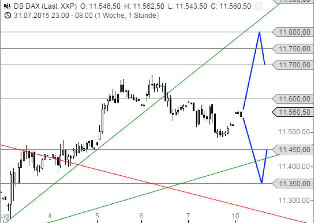 Die späte Zustimmung der Käufer dürfte heute für einen positiven Wochenauftakt sorgen. Zumindest erscheint nach der Schwäche vom Freitag eine erneute Attacke auf den Widerstand bei 11.600 Punkten möglich. Oberhalb dessen könnte es weitere Zugewinne bis in den Bereich von 11.700 bis 11.750 Punkte geben. Hadert der Dax hingegen erneut mit der Marke von 11.600 Punkten, kann eine nachfolgende Abwärtsbewegung bis zum Unterstützungslevel von 11.450 Punkten keinesfalls ausgeschlossen werden.