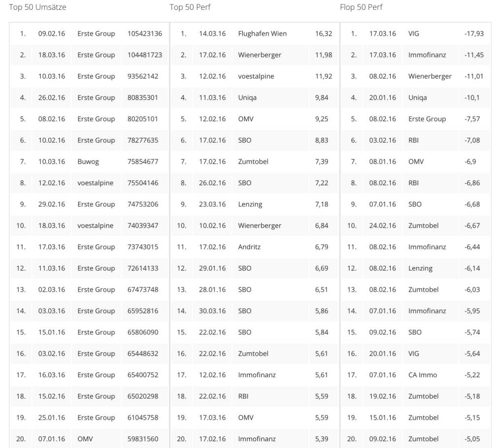 Bei den höchsten Tagesvolumina auf Einzeltitelbasis lag im Q1 gleich 6x die Erste Group vorne, zwei Mal mit mehr als 100 Mio. Euro. Dahinter die Buwog rund um die Abgabe des Blocks, den die Immofinanz gehalten hatte. Ich bin überzeugt, dass wir im Q2 weit höhere Tagesspitzenwerte sehen werden. Dafür wird wieder die MSCI-Umstellung sorgen, die auch in den vergangenen Jahren stets für die Top-Werte des Jahres sorgte.