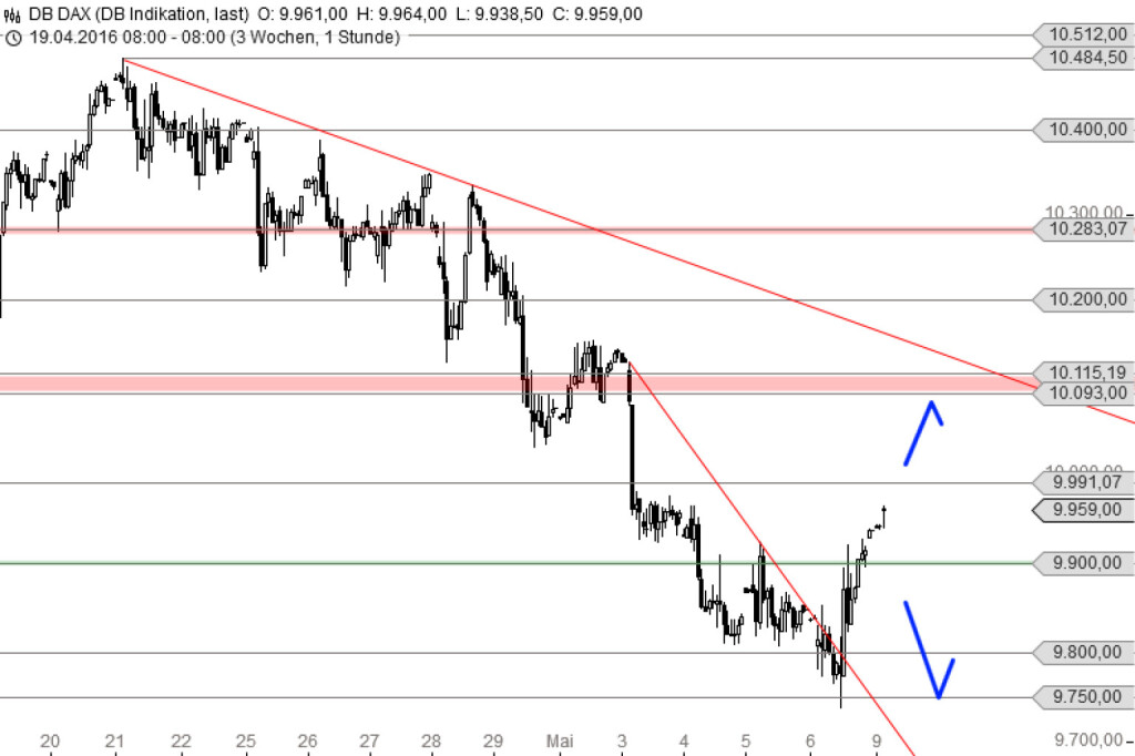 Seit Ende April befindet sich der DAX auf Talfahrt und fiel im Rahmen dieses Abverkaufs weit unter die Hochpunkte des März zurück. In der Spitze brach der Index am vergangenen Freitag bis an die zuletzt anvisierte Unterstützung bei 9.750 Punkten ein. Dort stoppte die Verkaufswelle und der Index stieg über die 9.900 Punkte-Marke an. Damit wurde eine relevante Unterstützung zurückerobert und ein weiteres massives Verkaufssignal verhindert.