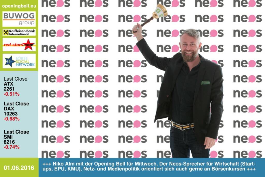 1.6.: Niko Alm läutet die Opening Bell für Mittwoch. Der Neos-Sprecher für Wirtschaft (Start-ups, EPU, KMU), Netz- und Medienpolitik orientiert sich auch gerne an Börsenkursen.