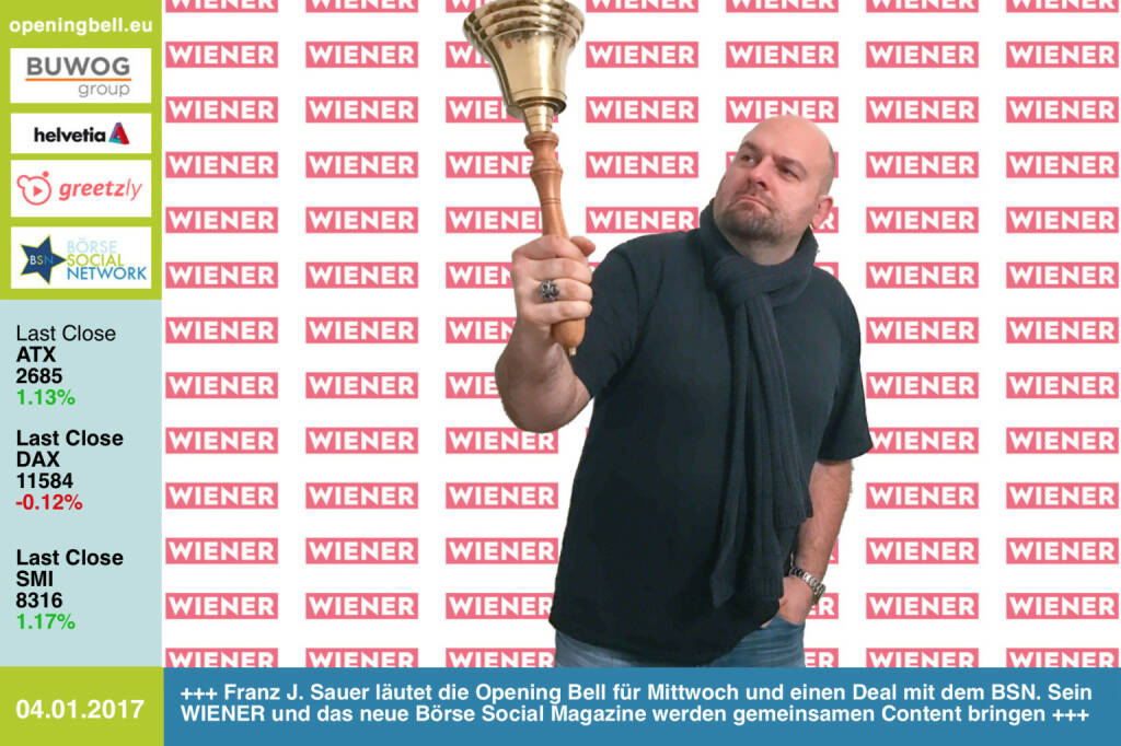 4.1.: Franz J. Sauer läutet die Opening Bell für Mittwoch und einen Deal mit dem BSN. Sein WIENER und das neue Börse Social Magazine werden in den jeweiligen Printausgaben gemeinsamen Content bringen http://wiener-online.at http://www.boerse-social.wien https://www.facebook.com/groups/GeldanlageNetwork/
