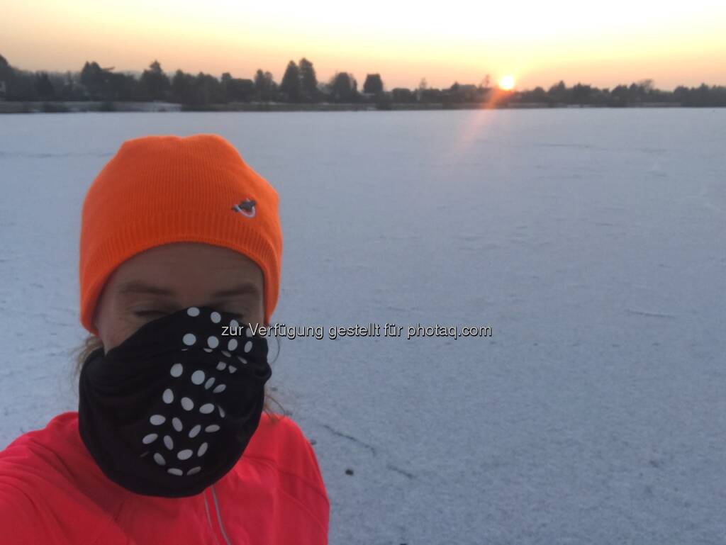 Die extra Belohnung war die Laufstrecke auf dem zugefrorenen Donaualtarm. Wirklich schön und mal was anderes. So liebe ich den Winter: ordentlich kalt und/oder viel Schnee. Ich weiß schon, was ich morgen Mittag machen werde: EISlaufen!! Es liegt eine Staubzuckerschicht Schnee am Eis, die beim Eislaufen nicht stört, aber beim Laufen super Grip gibt.