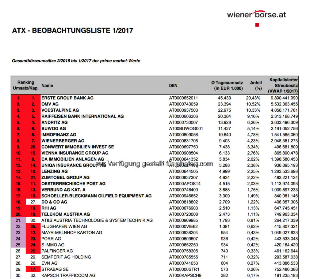 ATX-Beobachtungsliste 01/2017 (c) Wiener Börse