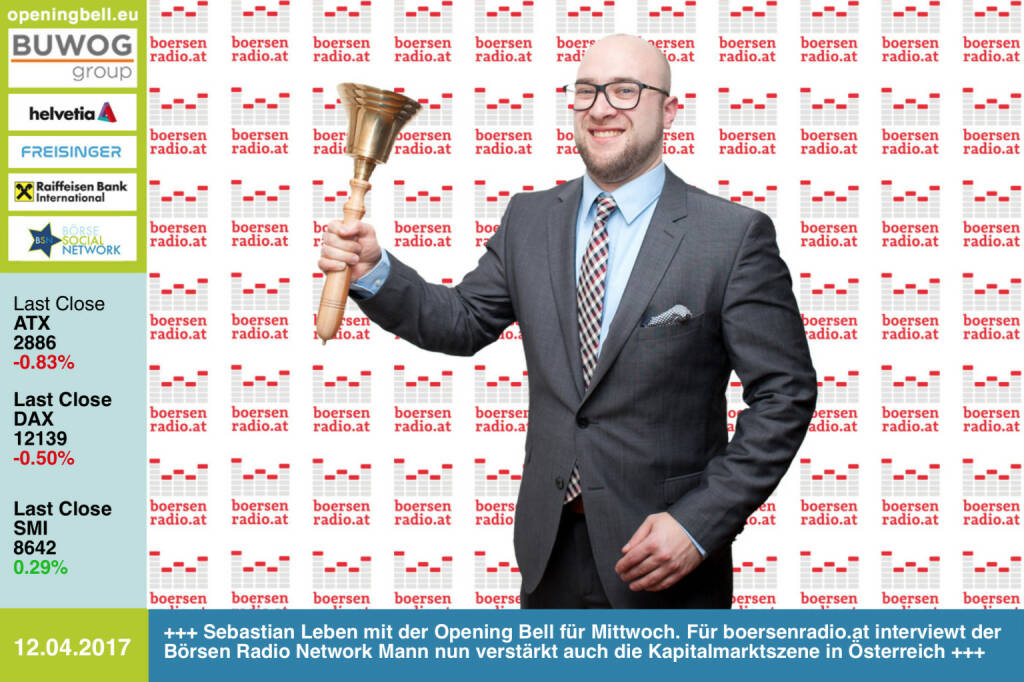 12.4.: Sebastian Leben mit der Opening Bell für Mittwoch. Für boersenradio.at interviewt der Börsen Radio Network Mann nun verstärkt auch die Kapitalmarktszene in Österreich http://www.boersenradio.at mit der Prime-Variante https://www.wienerborse.at/news/boersenradio/ . Transkript-Beispiel hier: http://boerse-social.com/2017/04/11/klaus_umek_fusion_ca_immo_immofinanz_wird_es_nicht_geben_aber_1 https://www.facebook.com/groups/GeldanlageNetwork/
