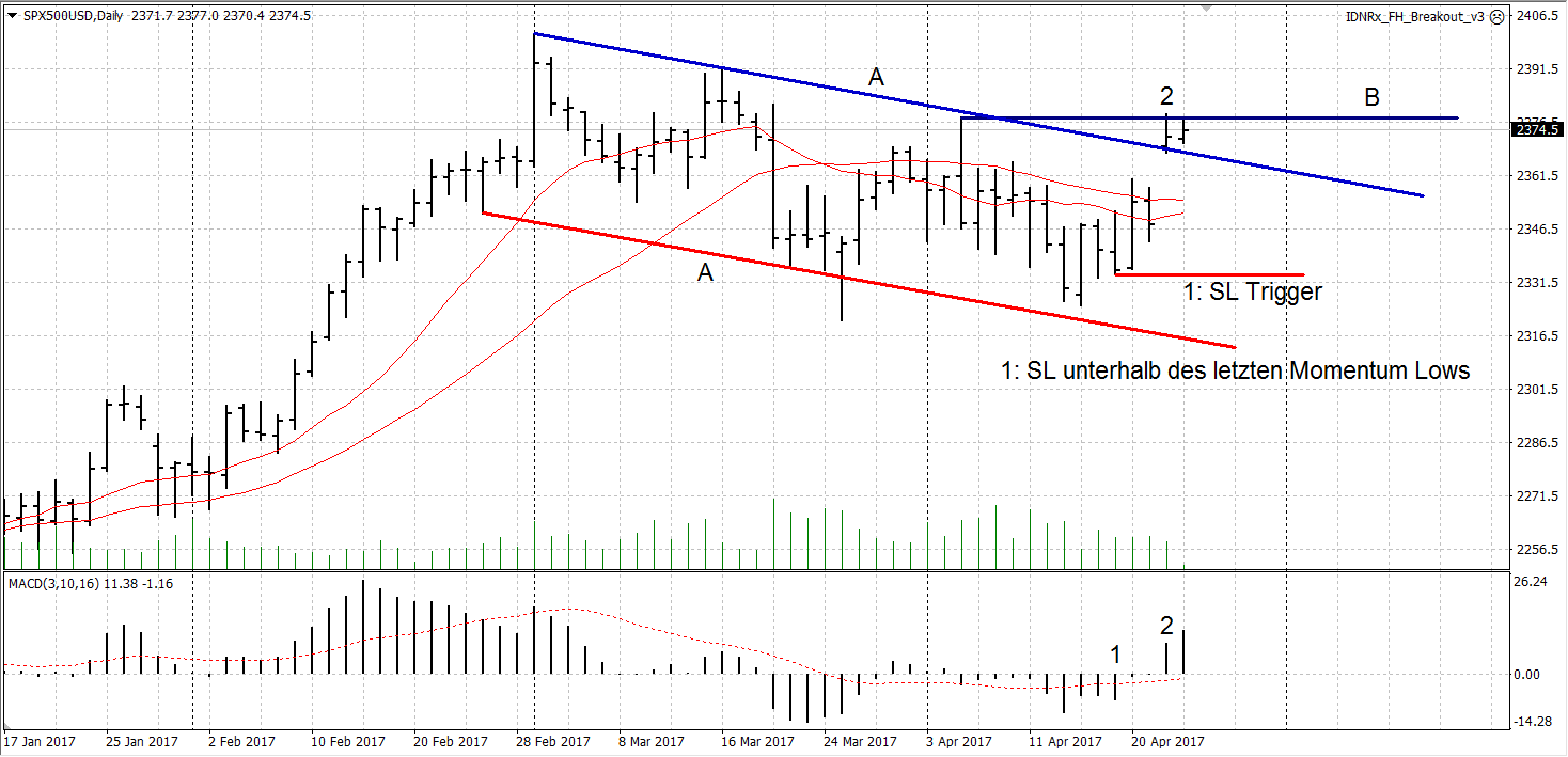 Die Flaggen Formation (A) bildete sich seit Ende Februar im SP500 heraus. Der Ausbruch gelang am gestrigen Handelstag in Verbindung mit einem New Momentum High (2). Was zusätzlich positiv wirkt, ist, dass der Markt gestern über der Flagge schließen konnte. Die nächste wichtige Hürde ist der Horizontale Widerstand B, der gestern nicht überwunden werden konnte. Ein Close Oberhalb des Widerstandes B bestätigt den Ausbruch, bis dahin gilt nur halbe Kraft voraus.
