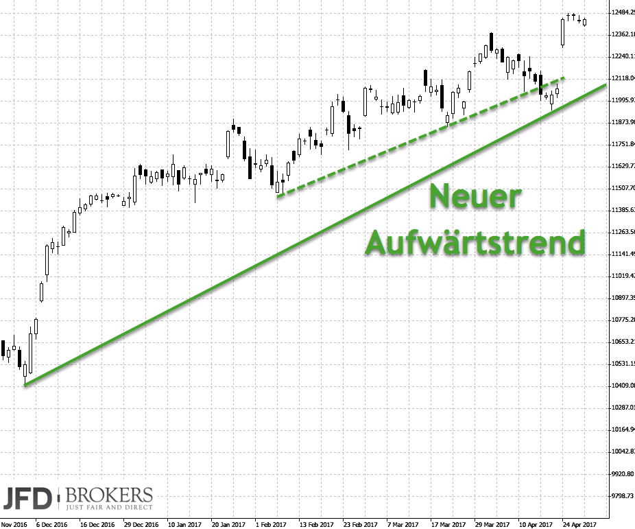 In der Vorwoche nannte ich parallel zur Frankreich-Vorwahl des neuen Präsidenten (der neuen Präsidentin?) meine Wochenanalyse „Das nächste Signal“ (HIER auf DIE BOERSENBLOGGER ->) und zielte darin auf eine größere Bewegung ab. Diese kam quasi über Nacht und verstärkte sich noch einmal am ersten Handelstag der Woche. Damit gab es neben dem Ergebnis selbst dann an der Börse etwas zu feiern: ein neues Allzeithoch!