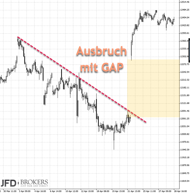 Die starke Eröffnung war jedoch noch nicht alles, denn binnen weniger Stunden erreichte der DAX schließlich sein Allzeithoch. Hier stockte es noch vor 4 Wochen, doch diesmal war der Druck der Bullen zu groß. Zaghaft, aber mit Nachdruck, wurde es überschritten und zu den Akten gelegt. Die 12.390 waren damit überschritten und ein neues Allzeithoch markiert – auch noch mit GAP, doch dazu später.