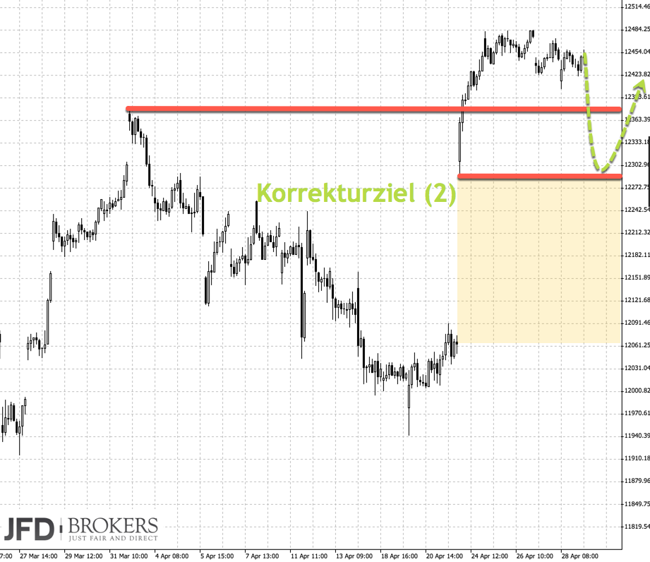 Auch von da kann der Kurs dann sehr schnell wieder nach oben abdrehen und die Korrektur damit abschließen. Die DAX-Korrektur nach dem Allzeithoch wäre somit abgeschlossen.