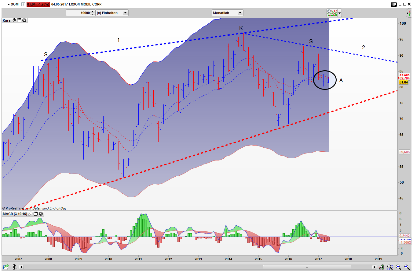 Der Bar Chart macht nicht viel mehr Mut. Die seit 2003 geformte Aufwärtstrendlinie hat zwar bisher gehalten, dennoch sieht das Bild nicht positiv aus. Die Aktie bildete seit der Finanzkrise einen Keil (1) in dem sie bisher gefangen ist. Alternativ kann man die Formation auch als eine Art Schulter Kopf Schulter Formation sehen. Hierbei bilden die Hochs der Zeitspanne 2007 bis 2008 die erste Schulter, das 2014er Hoch den Kopf und die 2016er Hochs die zweite Schulter.