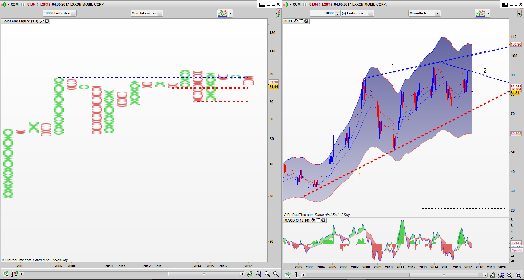 Seit 2006 befindet sich die Aktie von Exxon Mobil im Point and Figure Chart in einer Range. Die Ausbruchsversuche auf der Oberseite sind bisher gescheitert. In der Abwärtsbewegung der Jahre 2014 und 2015 wurde zu dem ein Verkaufssignal generiert, das bisher nicht negiert werden konnte.