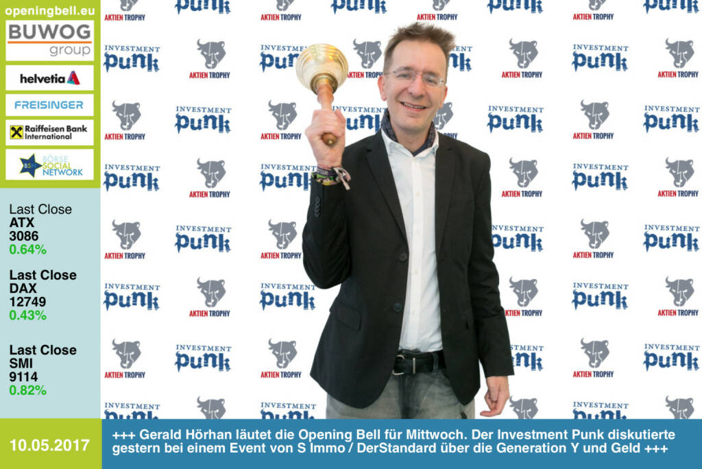 10.5.: Gerald Hörhan läutet die Opening Bell für Mittwoch. Der Investment Punk, Investor und Autor diskutierte gestern bei einem Event von S Immo / DerStandard über die Generation Y und Geld. Dies zum bevorstehenden Auftakt von http://www.aktientrophy.at http://www.investmentpunk.at http://www.derstandard.at https://www.facebook.com/groups/GeldanlageNetwork/