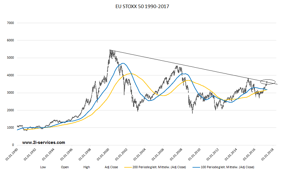 Dass er den Zeitpunkt für das Zurückfahren des Anleihekaufprogramms noch nicht für gekommen sieht darf, aus meiner Sicht als fader Beigeschmack für den langfristigen Investor verstanden werden. Denn, je länger die EZB damit wartet, umso mehr anstehende Probleme lassen sich bereits am Horizont erkennen, Stichwort Italien-Wahl im nächsten Jahr. Unter diesen Umständen frage ich mich, wann die Normalisierung denn eigentlich kommen soll? Für den kurz- bis mittelfristigen Anleger, dürfte die lockere Geldpolitik womöglich jedoch unterstützend sein. Wie dem auch sei. Im Zusammenhang mit dem EU-Aktiemarkt wollte ich heute Ihren Fokus nicht auf den DAX, sondern auf den EU STOXX 50 Index lenken.