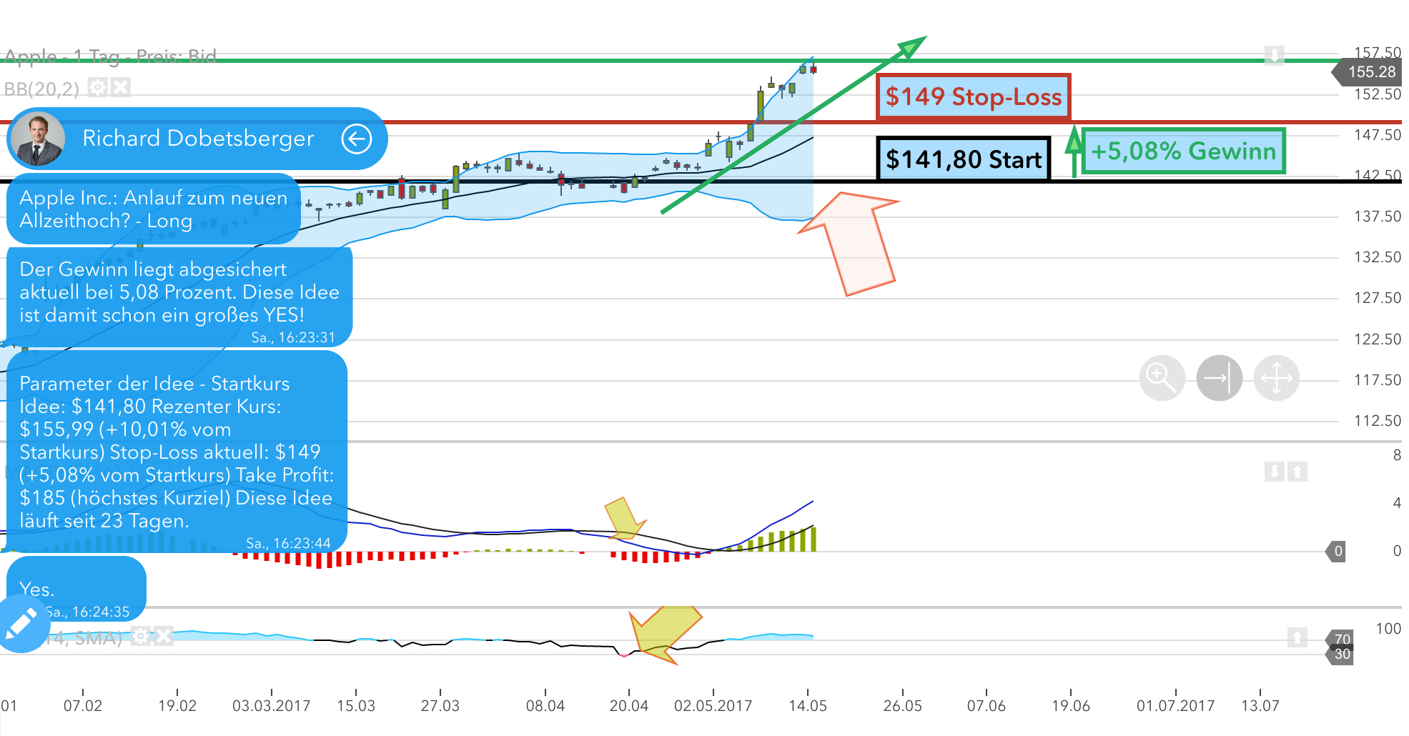 Vor rund drei Wochen schrieb ich an dieser Stelle über eine Apple Trading Idee. Ausschlaggebend für den Einstieg in diese Position bei Apple Inc. galten neben den fundamentalen und nachrichtenbasierenden Daten auch mögliche positive Indikatoren. So verwies ich auf den RSI (Relative Strength Index) der sich in einer überverkauften Situation befand und in Kombination mit anderen Parametern sich genau passend für den Angriff auf das Allzeithoch positioniert haben könnte. Dazu das Bild aus dem Rückblick noch einmal, Handelsplattform nextmarkets: