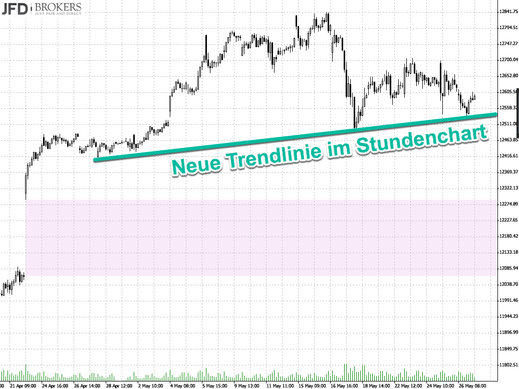Bis zu den Allzeithochs bei rund 12.840 Punkten (XETRA-Kurse) sind es allerdings auch noch mehr als 200 Punkte Abstand. Sie etablieren sich als Widerstand: