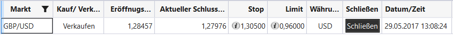 Der SL des Trades kommt oberhalb des Mai Hochs und das Endziel des Trades liegt bei ca. 0,95 USD je GBP. Zur Gewinnmitnahme kann das 2016er Tief dienen.
