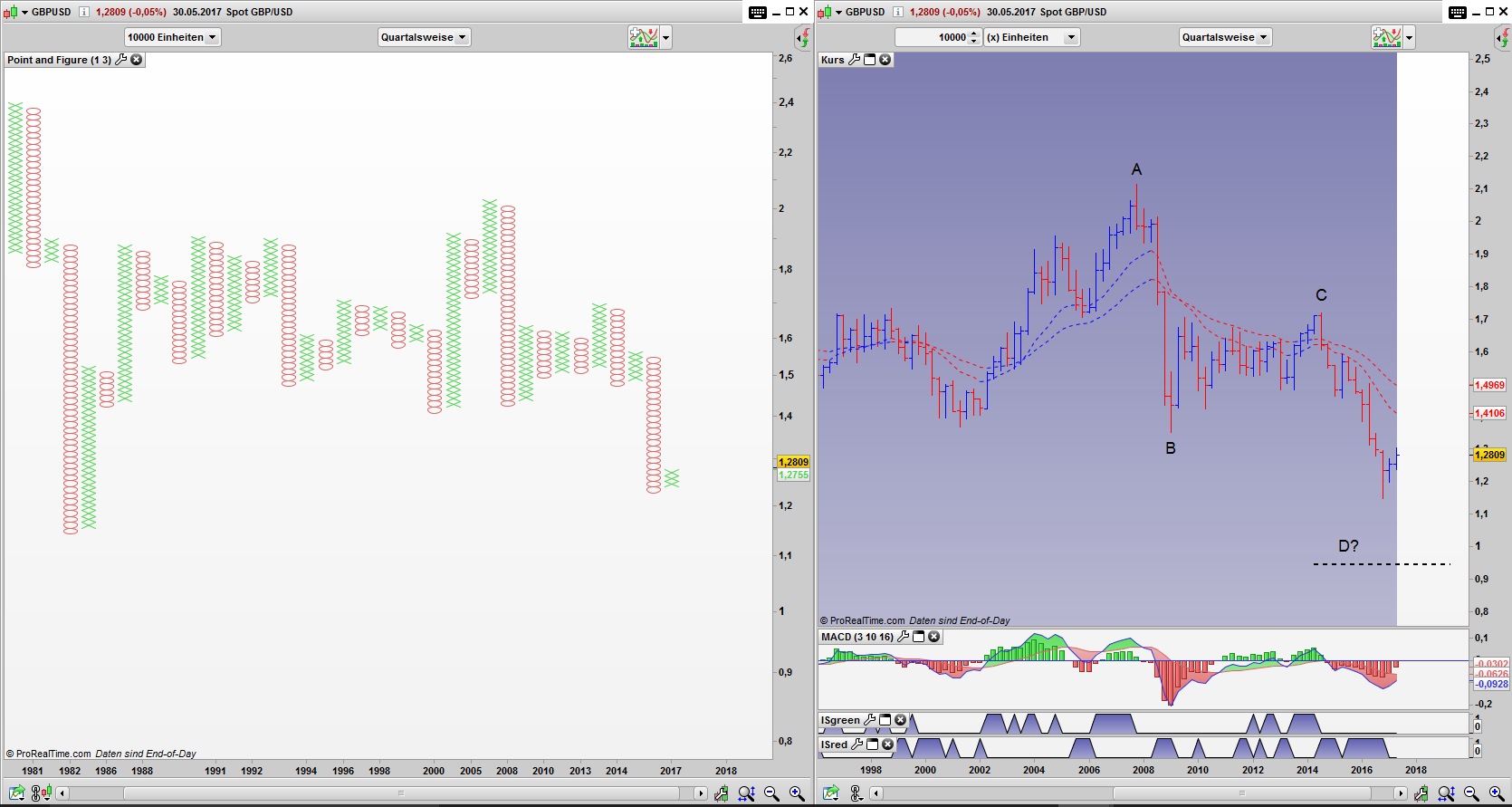 Der Point and Figure Chart ist eindeutig von den Bären dominiert. Die Schwäche des GBP gegenüber dem USD springt einen förmlich an. Die jetzige Bewegung könnte sich zu einer Wiederholung der 1980er Jahre entwickeln. Das würde absurd tiefe Kursziele zulassen. Doch bleiben wir realistisch und schauen uns erst einmal den Bar Quartalschart an. Dort erkennt man ganz gut die Chance auf ein ABCD Pattern, dessen Ziel unterhalb von 1 USD je GBP liegt.
