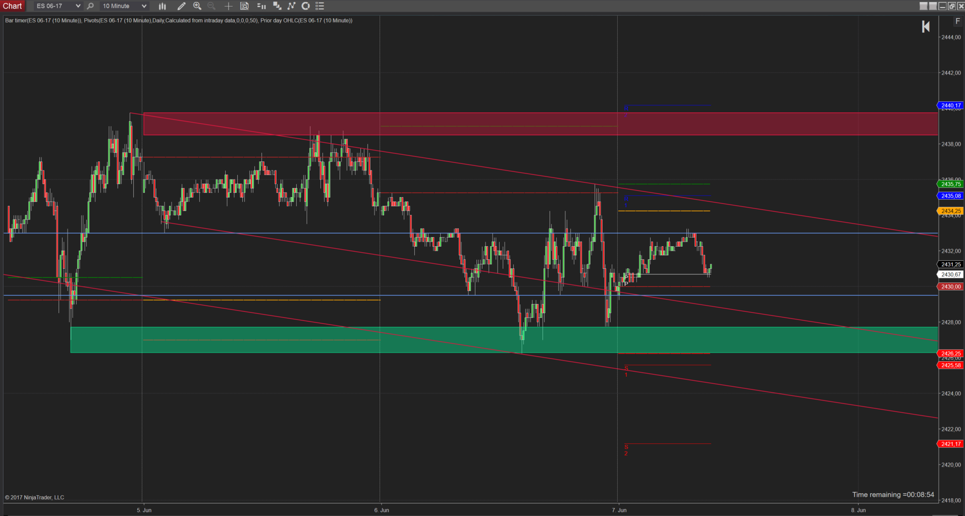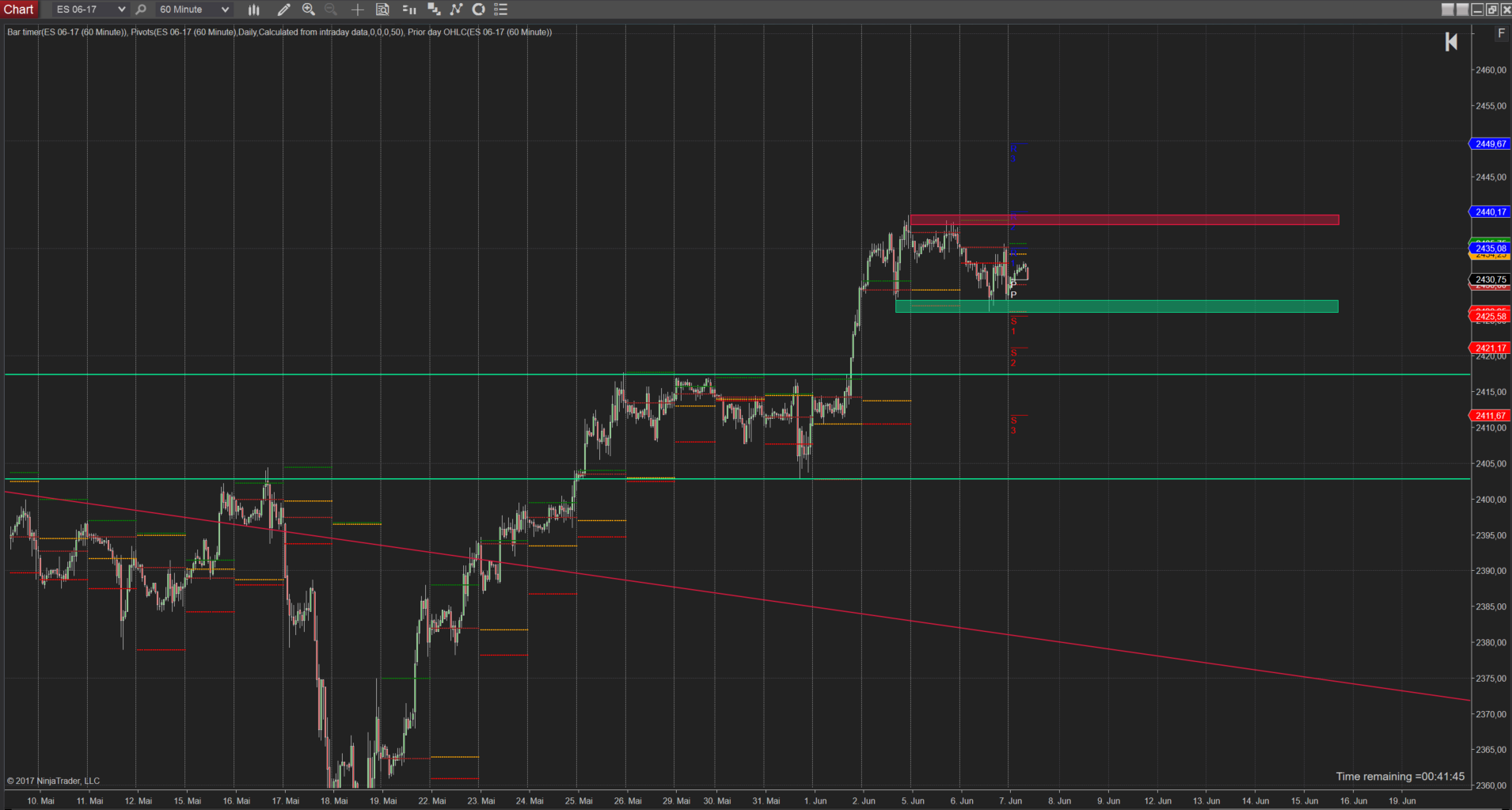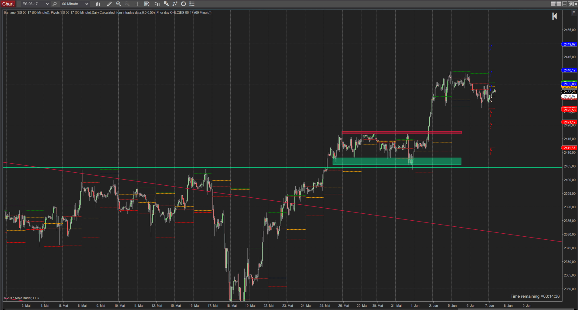 Ich hab im Chart ein paar Diagonalen und Horizontal zwei Linien reingelegt, an denen der Kurs des öfteren gedreht hatte. Dies ist auch das Stichwort, Rangehandel = Wende und da sollte nicht gleich auf den Monstermove gesetzt werden. Das Chartprogramm hat mir dann noch die Vortages Zonen Open, Close, High, Low dazugelegt und mehr braucht es aus meiner Sicht erstmal nicht.
