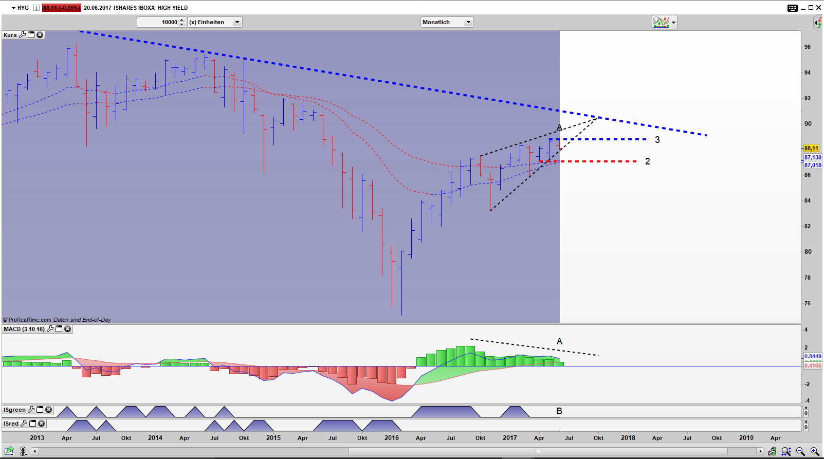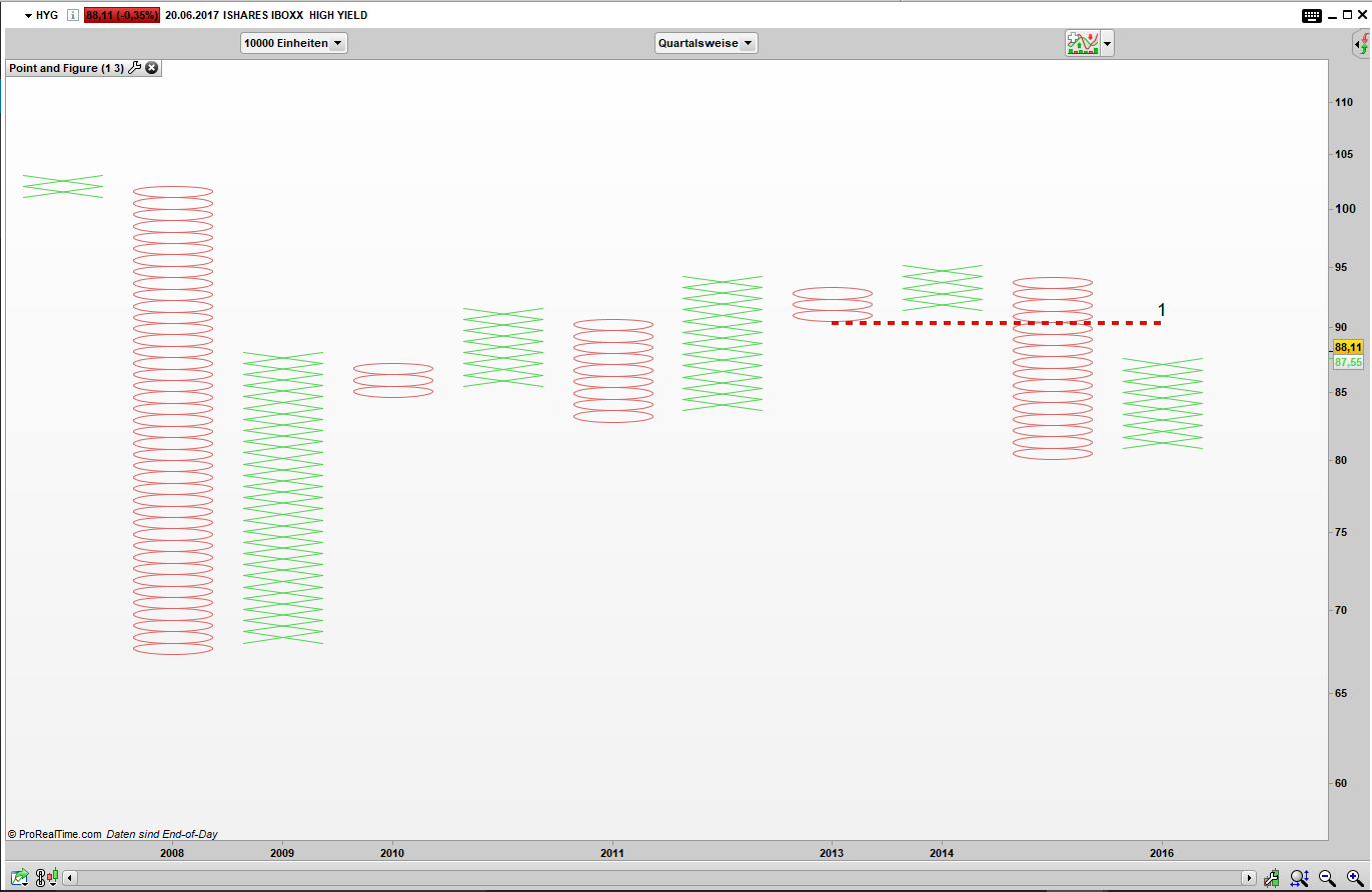Obwohl der High Yield Markt sich seit seinem letzten Tief im Februar 2016 erholt hat, ist es ihm nicht gelungen das Verkaufssignal 1 zu negieren. Das lässt einen zu der Vermutung kommen, dass der gesamte Anstieg nur eine Korrektur der Abwärtsbewegung darstellt. Mit einem erneuten absinken ist hier zu rechnen.