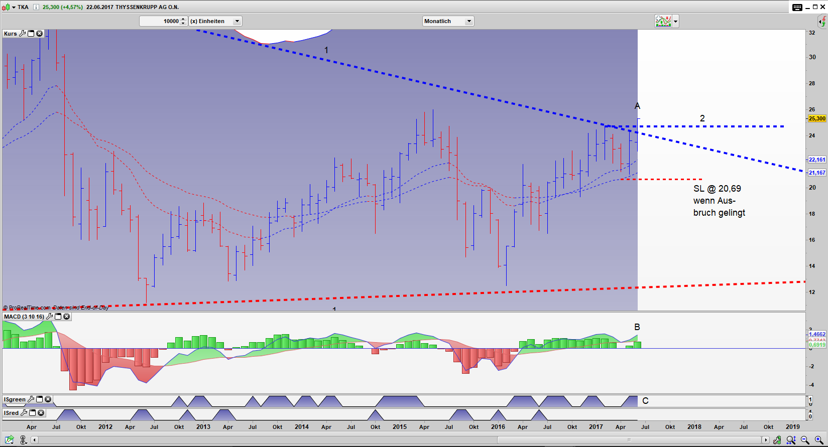 Thyssenkrupp ist der Ausbruch gelungen, die Aktie stieg es letzte Woche um 4,57% und schaffte damit den im Mai angesprochenen Dreiecksausbruch. Ob es an der Meldung zu den Seillosen Aufzügen lag, dass die Aktie so stark stieg ist ungewiss. Jedenfalls scheint es so, als würden die Investoren der Strategie und den Zukunftsaussichten des Konzerns mehr Vertrauen entgegenbringen.