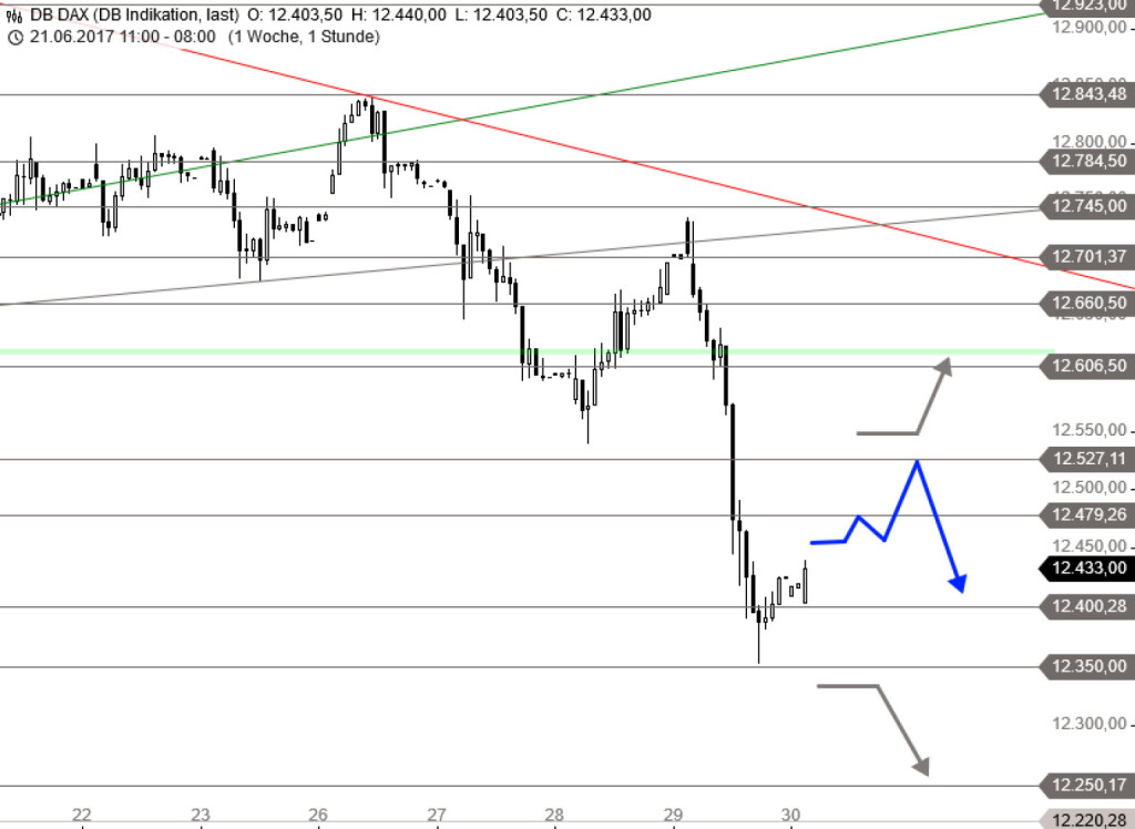 Rückblick: Nach der Verteidigung der 12.527 Punkte-Marke am Mittwoch, setzte sich die anschließende Erholung am Donnerstag im frühen Handel zunächst fort. Allerdings gelang es den Bullen nicht, die Barriere bei 12.745 Punkten zu durchbrechen. Kurz vor der Marke schlugen dann die Bären zu und sorgten für einen steilen Kursrutsch, der den Index direkt unter die 12.527 Punkte-Marke einbrechen ließ. In der Spitze erreichte der DAX im nachbörslichen Handel bereits den Support bei 12.350 Punkten.