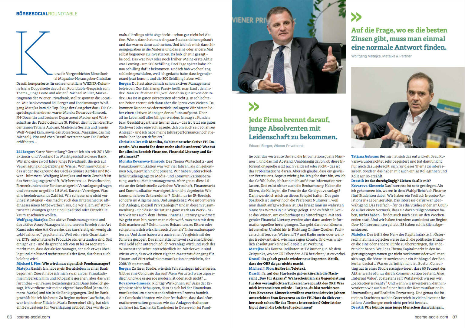 Kurz die Vorgeschichte: Börse Social Magazine-Herausgeber Christian Drastil komponierte für seine monatliche WIENER-Kolumne (siehe Doppelseite davor) ein Roundtable-Gespräch zum Thema „Junge Leute und Aktien“. Michael Müller, Marketingmann der Wiener Privatbank, stellte spontan die Location. Mit Bankvorstand Edi Berger und Fondsmanager Wolfgang Matejka kam die Top-Riege der Gastgeber dazu. Die Gesprächspartner/innen waren Monika Kovarova-Simecek, FH-Dozentin und Lecturer Department Medien und Wirtschaft an der Fachhochschule St. Pölten, die mit den drei Studentinnen Tatjana Aubram, Madeleine Serlath und Jasmin Wolf-Veigel kam, sowie das Börse Social Magazine, das mit Michael J. Plos und eben Drastil vertreten war. Die Banker eröffneten ... Fotoset: http://photaq.com/page/index/3137