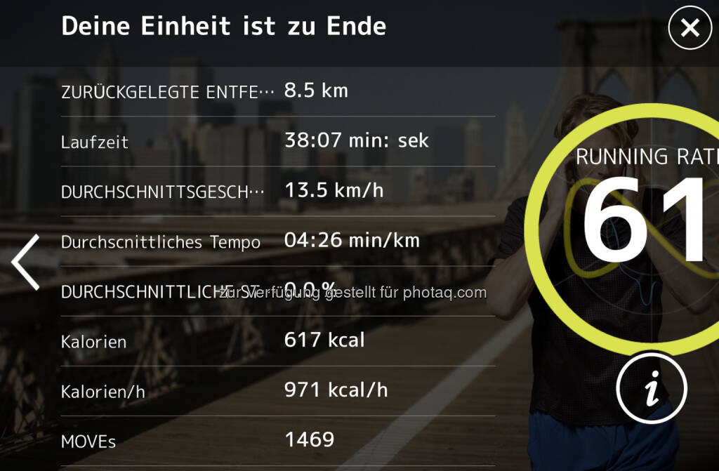 Gestern Teil 2 meines Trainingsprogramms auf dem Technogym Myrun gemacht. Es ging um einen für mich recht ambitionierten Tempodauerlauf, erst ein bissl 5:17, dann 9 Minuten 4:58, dann aber gleich 20 Min. 4:02, bevor wieder auslaufen anstand. Die 20 Min. hatten es schon in sich. Zum Glück war auf N24 ein spannendes TV-Programm zu konsumieren.