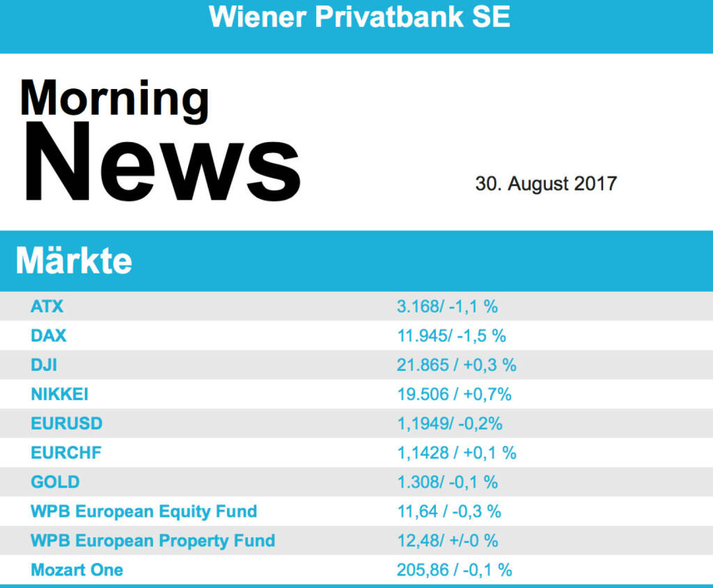 Die Konsolidierungsphase an den europäischen Börsen wurde auch gestern weiter fortgesetzt, ein neuerlicher Raketentest Nordkoreas und der anhaltend starke Euro liessen die Anleger weiter auf der Seitenlinie verharren. Allerdings gab es am Nachmittag, getrieben von der relativ unbeeindruckten Börse in den USA, doch deutliche Zeichen einer Erholung und ein guter Teil der Verluste konnte wettgemacht werden. Schwächster Sektor in Europa waren die Medienwerte mit einem Abschlag von knapp 2,0%. Sie litten unter weiteren Signalen eines schwachen TV-Werbegeschäfts, ausgelöst durch eine diesbezügliche Meldung von ProSiebenSat.1. Die Aktien des deutschen Medienunternehmens brachen daraufhin 14,5% ein. Ebenfalls schwach waren weiter die Versicherungsunternehmen, der Sektor gab 1,6% nach, hier belasteten die möglichen Verluste ausgelöst durch den Wirbelsturm Harvey in Texas. Zulegen konnten in London die Kurse der Bergwerksgesellschaften, die von den gestiegenen Preisen für Edel- und Industriemetalle profitierten. Angeführt wurde der Sektor von Randgold mit einem Plus von 4,6%.