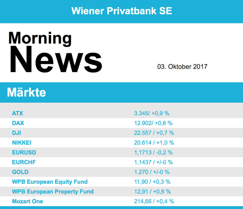 Die Indices in den USA haben sich gleich zu Beginn des vierten Quartals zu neuen Rekordhöhen aufgeschwungen, der Dow Jones übersprang erstmals in der Geschichte die Marke von 22.500 Punkten. Ausgelöst wurde die positive Stimmung durch makroökonomische Daten, der ISM-Index für das verarbeitende Gewerbe fiel über Erwartungen aus und erreichte den höchsten Wert seit 13 Jahren. Die US-Konjunktur schaltet damit einen Gang rauf. Auch die Bauausgaben hatten im August nach einem kräftigen Rückgang im Vormonat etwas stärker als erwartet zugelegt, trotz der wetterbedingten Ausfälle. Verkauft wurden die Aktien von Hotel- und Kasinobetreibern, MGM Resorts sackte fast 6,0% ab. PepsiCo litt unter einer gestrichenen Kaufempfehlung und gab rund 2,0% ab.