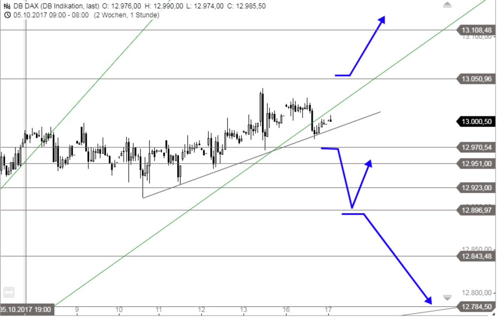 Aktuell steht der DAX leicht über dem gestrigen Schlusskurs. Um ein neues Kaufsignal zu erhalten, müsste der Deutsche Aktienindex über 13.050 Punkten ausbrechen. Anschließend könnte ein dynamischer Anstieg bis ca. 13.125 Punkten stattfinden. Eine markante horizontale Unterstützung liegt bei 12.970 Punkten. Wird dieser Support auf Stundenbasis gebrochen, dann wäre ein Rückgang bis knapp unter die 12.900 Punkte-Marke denkbar. Dort könnte dann ein Rebound nach oben folgen. Wird diese Unterstützung allerdings durchbrochen, dann könnten die Bären das Ziel bei 12.784 Punkten anvisieren.