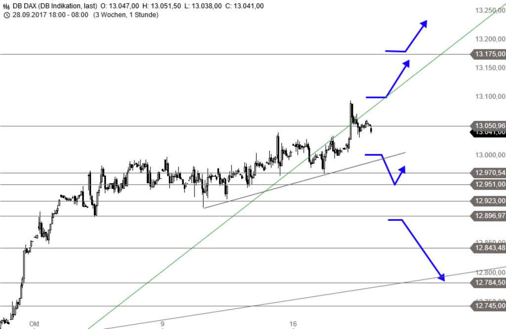 Rückblick: Ausgehend von der 13.000 Punkte-Marke setzte beim DAX im gestrigen Handel ein Aufwärtsimpuls ein, der den Index zunächst über die Oberseite der Range der letzten Tage ausbrechen ließ. In der Spitze erreichte der Index ein neues Rekordhoch bei 13.094 Punkten. Am Nachmittag begannen die Kurse jedoch wieder zu bröckeln und der DAX setzte auf seine frühere Rekordmarke bei 13.030 Punkten zurück.