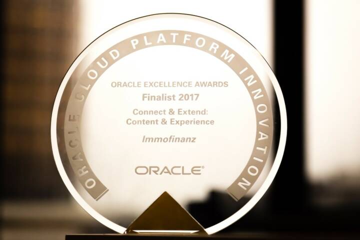 Der Weg der IMMOFINANZ in eine neue, digitale Ära sorgte allerdings nicht nur im eigenen Haus und bei den Zielgruppen des Unternehmens für Aufmerksamkeit: Im September 2017 konnte die IMMOFINANZ den weltweit ausgelobten und in San Francisco verliehenen „Oracle Excellence Award“ in der Kategorie „Cloud Plattform Innovation“ ins Haus holen und schaffte es, sich gegen Mitbewerber aus der ganzen Welt erfolgreich durchzusetzen.