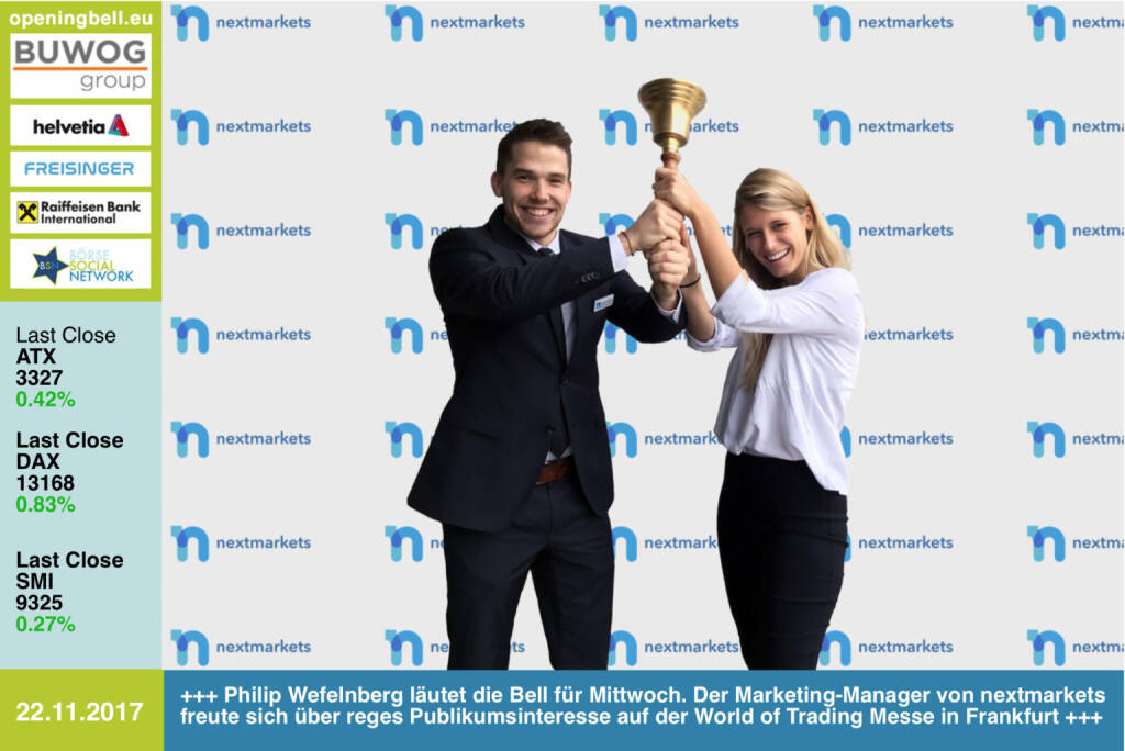 22.11.: Philip Wefelnberg läutet die Opening Bell für Mittwoch. Der Marketing-Manager von nextmarkets freute sich über reges Publikumsinteresse auf der World of Trading Messe in Frankfurt http://nextmarkets.com/de/home #wot https://www.facebook.com/groups/GeldanlageNetwork/ #goboersewien