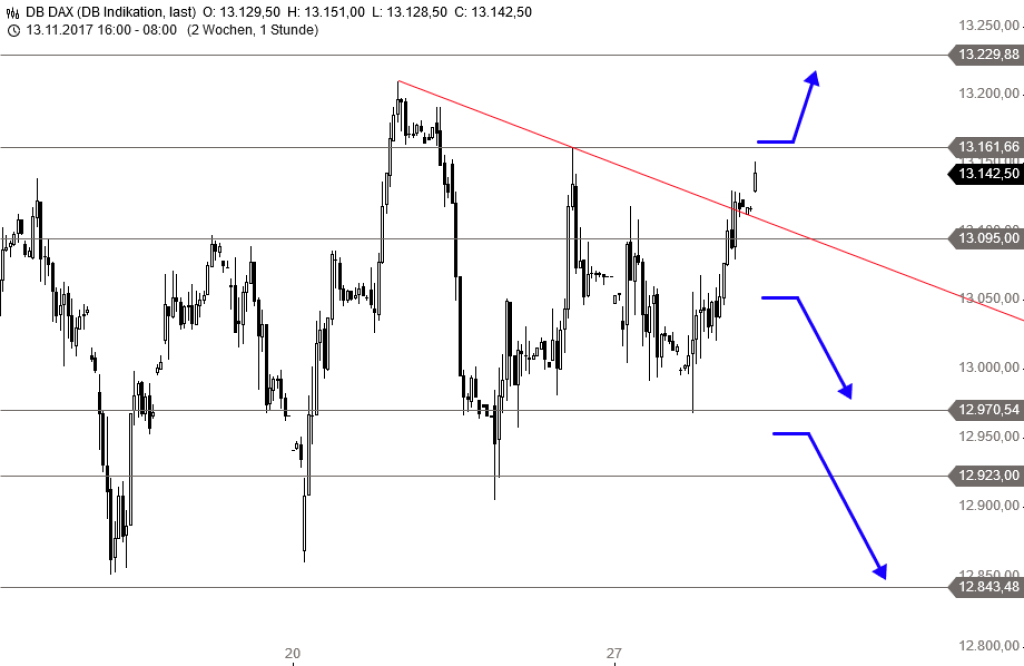 Rückblick: Der DAX befindet sich nach dem Einbruch Anfang November aktuell in einem Seitwärtsmarkt. Auf der Unterseite wird dieser durch die Unterstützung bei 12.843 Punkten begrenzt. In den letzten Tagen konnte sich der Index zwar von der Unterseite lösen, jedoch nicht über den Widerstand bei 13.229 Punkten ausbrechen. Im gestrigen Handel startete an der 12.970 Punkte-Unterstützung ein weiterer Anstieg, der über die Hürde bei 13.095 Punkten führte. Doch jetzt stellen sich dieser Erholung etliche Widerstände in den Weg.