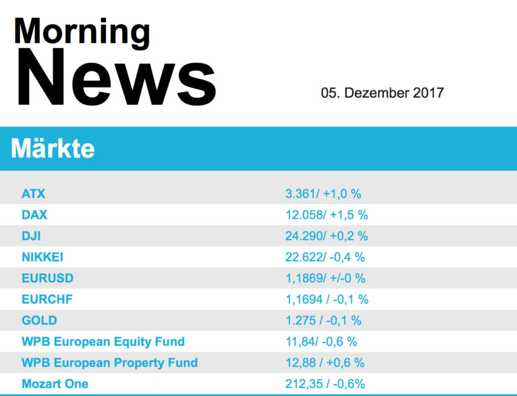 Von der Steuerreform in den USA könnten auch einige deutsche Unternehmen profitieren, hieß es im Handel. FMC seien hier ein Gewinner. Ein Großteil des Dialyse-Geschäfts entstehe in den USA. Die FMC-Aktie gewann 4,4 Prozent. Die Aktie der Mutter Fresenius erhöhte sich um 3,1 Prozent. Daneben wurden Deutsche Telekom, BMW, BASF, Brenntag und Covestro als potenzielle Gewinner der US-Steuerreform genannt. Deutsche Telekom verbesserten sich um 1,8 Prozent, BMW um 2,1 Prozent, und BASF um 1,8 Prozent. In Wien legte der ATX um 1% zu, gekauft wurden S-Immo (++,4%), Buwog (+2,2%) und Andritz (+2,0%).
