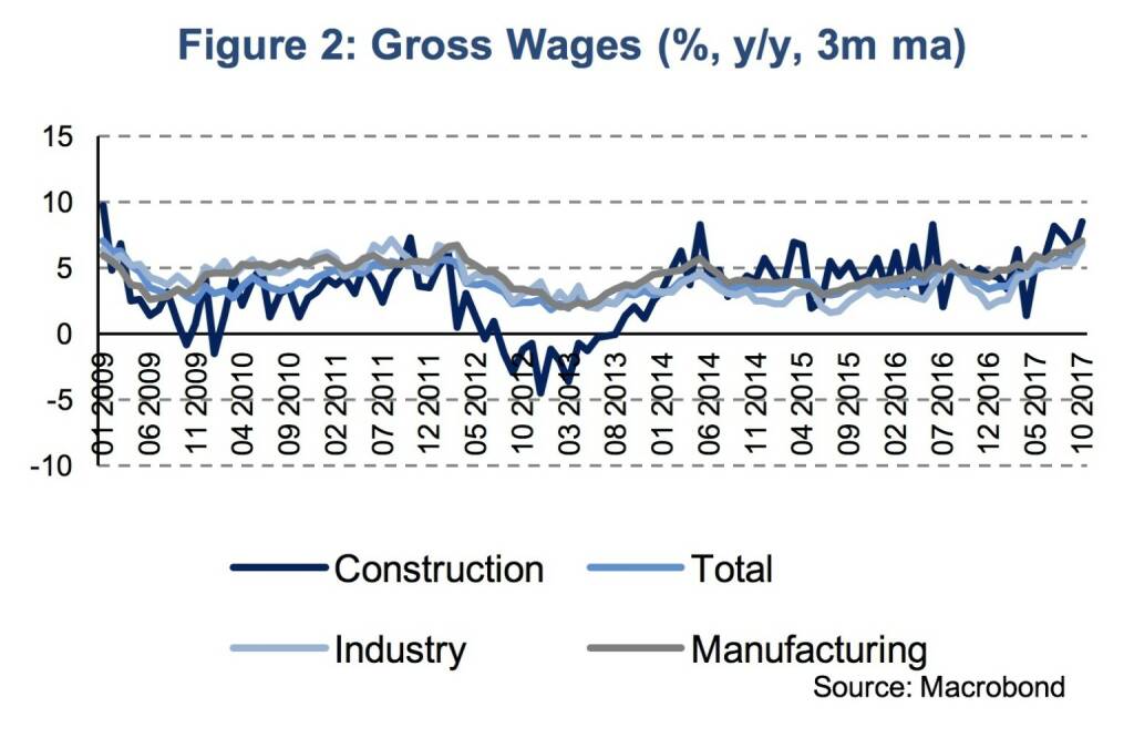 The labor market shows first signs of inflationary pressure. Figure 2 displays the development of gross wages in various sectors of the economy. In October gross wages increased by 7.4 % (y/y) after 6 % in September. Wage pressure is supported by a record low unemployment rate of 6.6 in October and steady employment growth of above 4 % since the beginning of the year. This is in spite of a positive labor supply shock of immigrations from Ukraine. According to estimates from the NBP there will be 1.2 million immigrants from Ukraine in 2017, or 4 % of the Polish labor force.