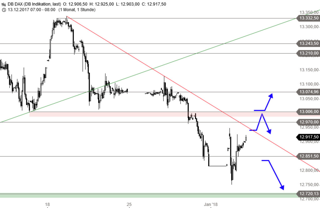 Rückblick: Seit Mitte Dezember setzt sich der Abwärtstrend beim DAX fort, der seinen Ausgang am neuen Rekordhoch bei 13.525 Punkten Anfang November hatte. Dabei wurden sowohl der wichtige Unterstützungsbereich bei 12.970 Punkten, als auch die Unterstützung bei 12.851 Punkten unterschritten. Im gestrigen Handel brach der Index zunächst auf ein neues Tief bei 12.751 Punkten ein, ehe eine steile Erholung über die 12.851 Punkte-Marke zurückführte. Der Gegenangriff der Bullen könnte sich heute fortsetzen.
