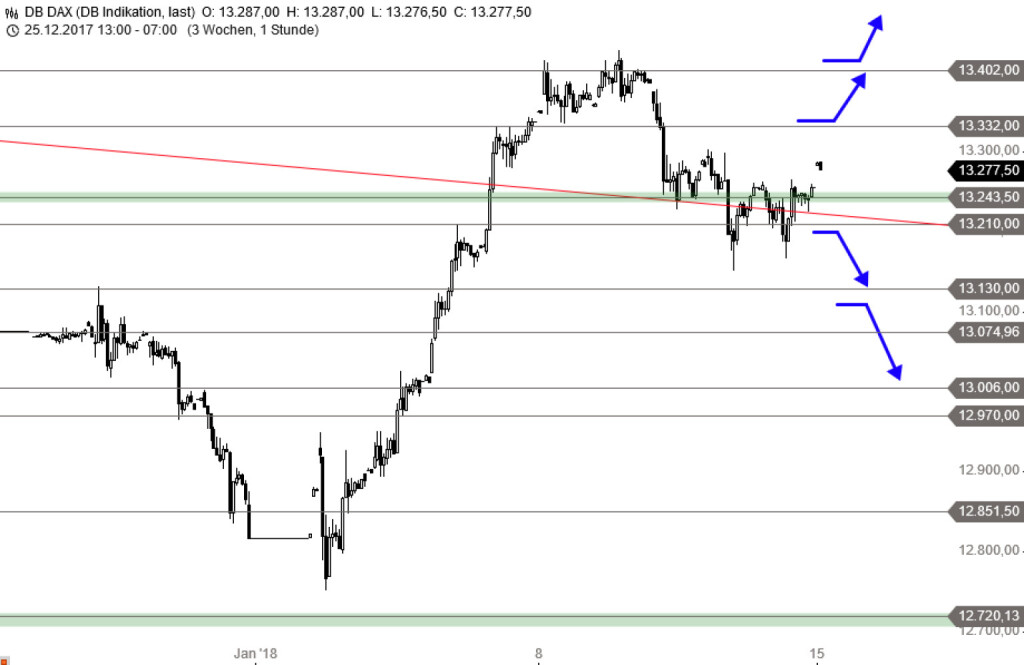 Rückblick: Mit Jahresbeginn startete beim DAX eine massive Aufwärtsbewegung, die den Index vom Unterstützungsbereich um 12.720 Punkten bis über die Hürde bei 13.332 Punkte anschob. In der Spitze wurde die Zielmarke bei 13.402 Punkten erreicht, ehe die Kurse anfingen zu bröckeln. Insbesondere die zweite Wochenhälfte war von einer dynamischen Korrektur geprägt, die den Index bisweilen auch unter den Support bei 13.210 Punkten drückte. Am Freitag konnte sich der DAX jedoch wieder etwas von den Zwischentiefs lösen und über die 13.243 Punkte-Marke zurückfinden.