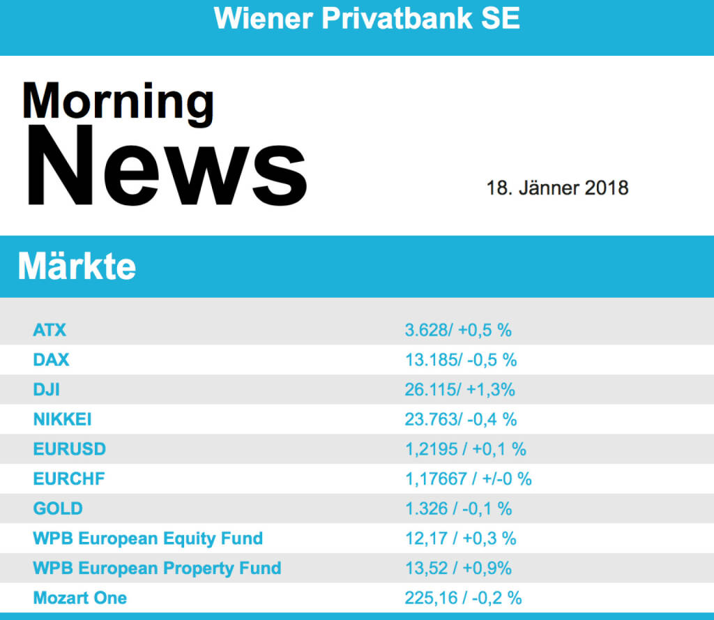 Vorbörslich sind die europ. Börsen leicht positiv indiziert. Die asiatischen Börsen schließen uneinheitlich. Von der Makroseite wurde heute Früh gemeldet, dass das BIP im vierten Quartal in China um 6,8% (erwartet wurden 6,7%) gestiegen ist.Ein weiteres Zeichen, dass China weiter stabil wächst In den USA berichten heute American Express und Morgan Stanley.