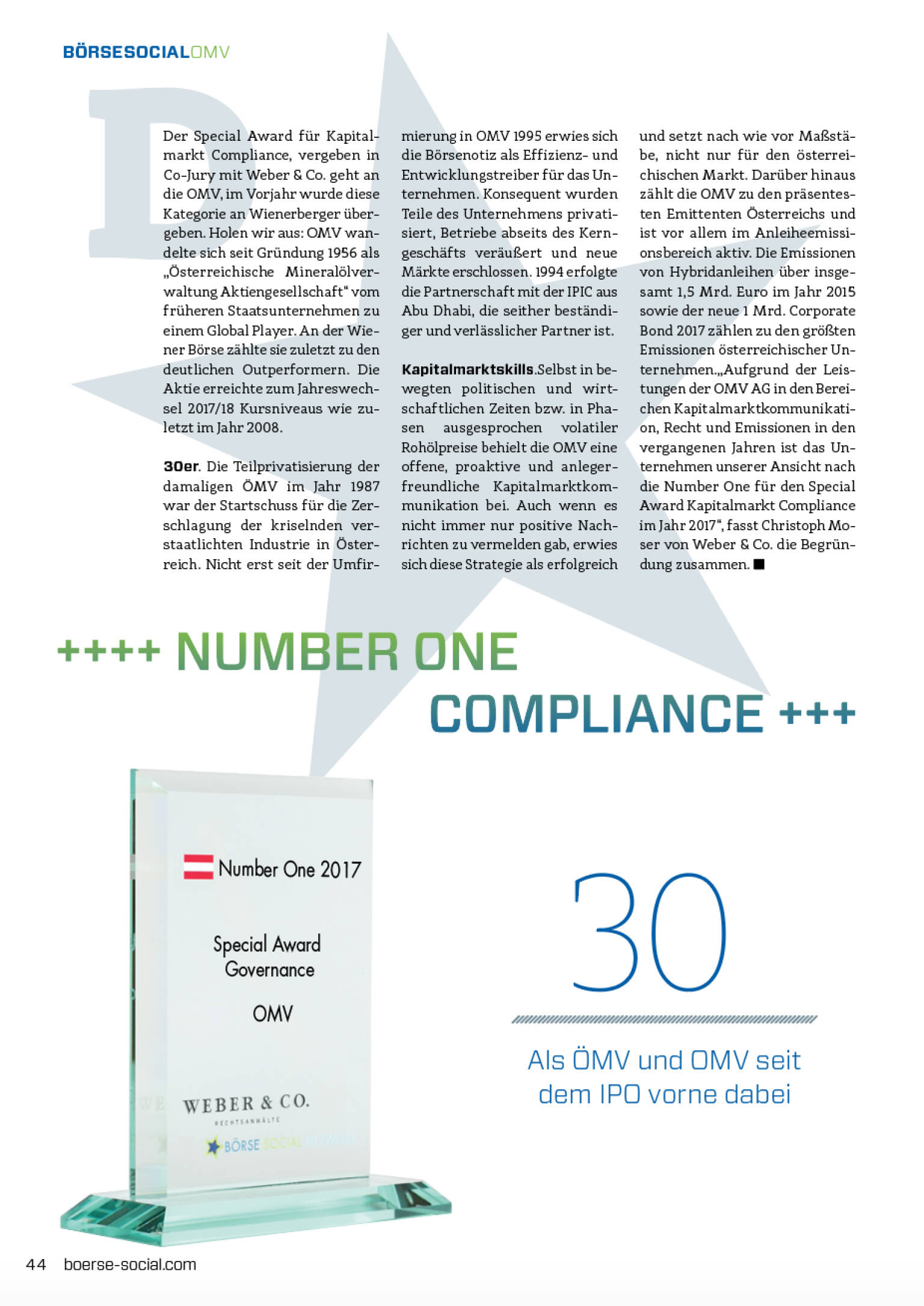 Kapitalmarktskills.Selbst in bewegten politischen und wirtschaftlichen Zeiten bzw. in Phasen ausgesprochen volatiler Rohölpreise behielt die OMV eine offene, proaktive und anlegerfreundliche Kapitalmarktkommunikation bei. Auch wenn es nicht immer nur positive Nachrichten zu vermelden gab, erwies sich diese Strategie als erfolgreich und setzt nach wie vor Maßstäbe, nicht nur für den österreichischen Markt. Darüber hinaus zählt die OMV zu den präsentesten Emittenten Österreichs und ist vor allem im Anleiheemissionsbereich aktiv. Die Emissionen von Hybridanleihen über insgesamt 1,5 Mrd. Euro im Jahr 2015 sowie der neue 1 Mrd. Corporate Bond 2017 zählen zu den größten Emissionen österreichischer Unternehmen.„Aufgrund der Leistungen der OMV AG in den Bereichen Kapitalmarktkommunikation, Recht und Emissionen in den vergangenen Jahren ist das Unternehmen unserer Ansicht nach die Number One für den Special Award Kapitalmarkt Compliance im Jahr 2017“, fasst Christoph Moser von Weber & Co. die Begründung zusammen.