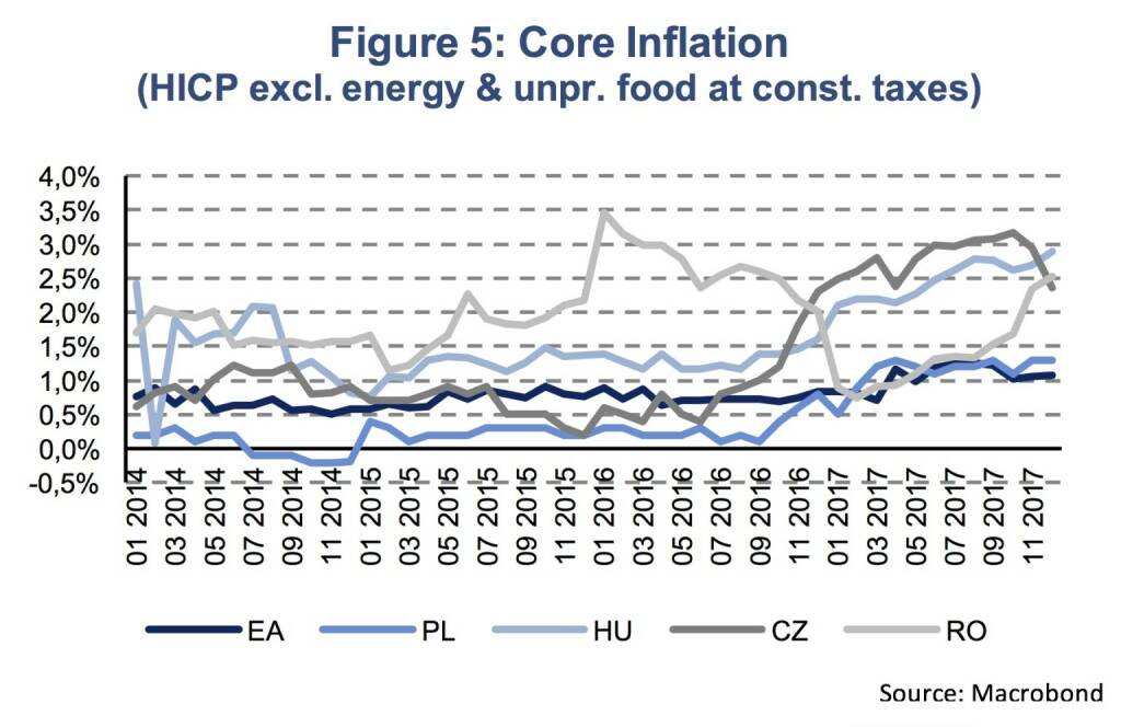 - This is accompanied by average core inflation being more than double as high in CZ, HU and RO compared to the average rate in PL and EA.