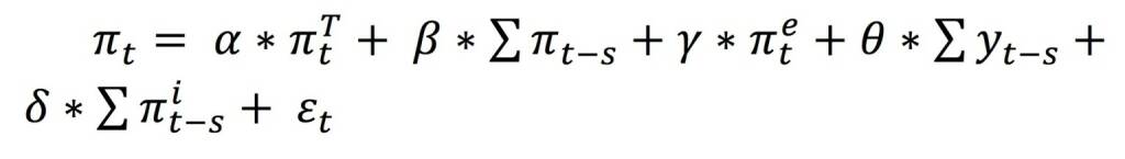 The Phillips Curve goes back to a seminal article in 1958 in which A.W. Phillips describes the relationship between unemployment and wage inflation in the UK [3]. The Phillips Curve, then, became a vital policymaking tool of the 1960s linking inflation to the unemployment rate and past inflation. During the 1970s when the US experienced a period of high inflation and high unemployment, the Phillips Curve was modified to consider the importance of inflation expectations, known as the expectations-augmented Phillips Curve (Friedman, 1968, and Phelps, 1967)[4]. As a response, New Keynesian Macroeconomics combined rational expectations with sticky prices, forming the New Keynesian Phillips Curve (NKPC). The NKPC links inflation to expected future inflation and the amount of slack in the economy. Galí and Gertler (1999) propose a hybrid version of the NKPC which additionally accounts for backward looking price setting behavior [5]. Until now, this hybrid NKPC is set as the empirical standard incorporating the following determinants. Inflation πt in period t is explained by past inflation πt-s in period t-s, future expected inflation πe and a measure of the state of the economy yt. Economic slack is most often proxied by the output gap. Alternatively, measures of labor market slack related to the unemployment rate are used. With the increasing internationalization of the global economy, non-domestic price setting might have gained importance for domestic inflation dynamics. Particularly so, for small open economies like those of the CEE region [6]. Hence, we add a term measuring imported inflation πit-s. Furthermore, instead of adding a constant we use the inflation target πT. Our Phillips Curve takes the following form: