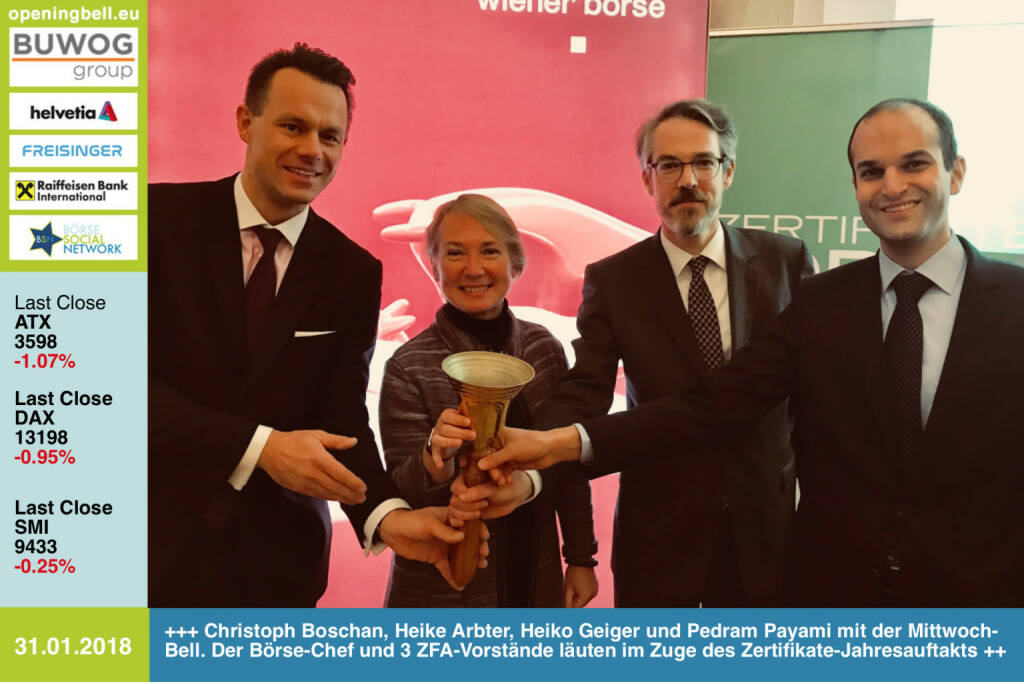 31.1.: Christoph Boschan, Heike Arbter, Heiko Geiger und Pedram Payami mit der Opening Bell für Mittwoch. Der Börse-Chef und die ZFA-Vorstände läuten im Zuge des Zertifikate-Jahresauftakts live an der Wiener Börse http://www.zertifikateforum.at http://www.wienerborse.at https://www.facebook.com/groups/GeldanlageNetwork #goboersewien