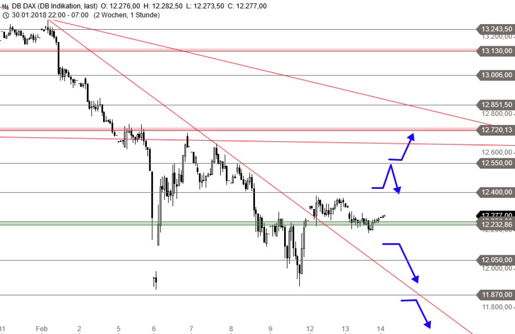 Charttechnischer Ausblick (Stand: 8.00 Uhr): Der steile Abwärtstrend beim DAX ist nach wie vor intakt. Entsprechend ist jederzeit mit einem erneuten massiven Verkaufsimpuls zu rechnen, der die Erholung der letzten Tage schlagartig beenden dürfte. Oberhalb von 12.232 Punkten könnte der Index dennoch erneut in Richtung der 12.400 Punkte-Marke klettern. Sollte die Barriere überwunden werden, könnte die Erholung kurzzeitig bis 12.550 Punkte führen. Dort dürften die Bären wieder zuschlagen. Doch selbst ein Ausbruch über diesen Widerstand hätte aktuell nur eine Ausweitung der Erholung bis 12.618 und 12.720 Punkte zur Folge. Setzt der Index dagegen unter 12.232 Punkte und anschließend auch unter der 12.150 Punkte zurück, wäre die Erholung gestoppt. Im Anschluss könnte es direkt zu einem Einbruch bis 12.000 Punkte und darunter bereits bis 11.870 Punkte kommen.