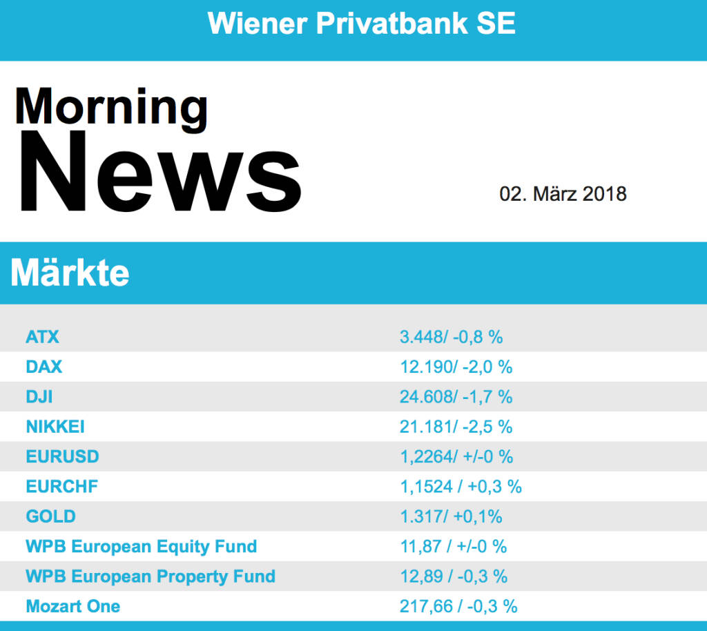 Gestern konnte sich die Börse in Wien nicht mehr dem europäischen Umfeld entziehen und musste ebenfalls abgeben, der ATX fiel um 0,8%. Der chinesische Investor Fosun will Wolford übernehmen, der Vorarlberger Wäschekonzern konnte auf Grund dieser Meldung einen Kurssprung von 10,2% erzielen. CA Immo meldete einen Rekordgewinn, dieses Ergebnis im Verein mit dem Umstand, dass die geplante Fusion mit Immofinanz aller Voraussicht nach nicht stattfinden wird, trieb den Aktienkurs 5,6% nach oben. Nur knapp schwächer war S immo, am Vorabend hatte das Unternehmen bekanntgegeben dass die Beteiligung an Immofinanz auf knapp 12 Prozent aufgestockt wurde, der Titel konnte gestern ein Plus von 5,2% einfahren. Auch Immofinanz erholte sich deutlich und legte 1,7% zu. Nach dem starken Vortag kam es bei Wienerberger zu deutlichen Gewinnmitnahmen, der Ziegelhersteller musste 2,3% abgeben. Erste Group verbilligte sich leicht um 0,6%. Andritz gab am Vortag der Ergebnispräsentation 1,9% ab. Deutlichster Verlierer am ersten Handelstag des Monats war AT&S mit einem Minus von 6,3%, auch VoestAlpine schwächte sich um 2,7% ab.