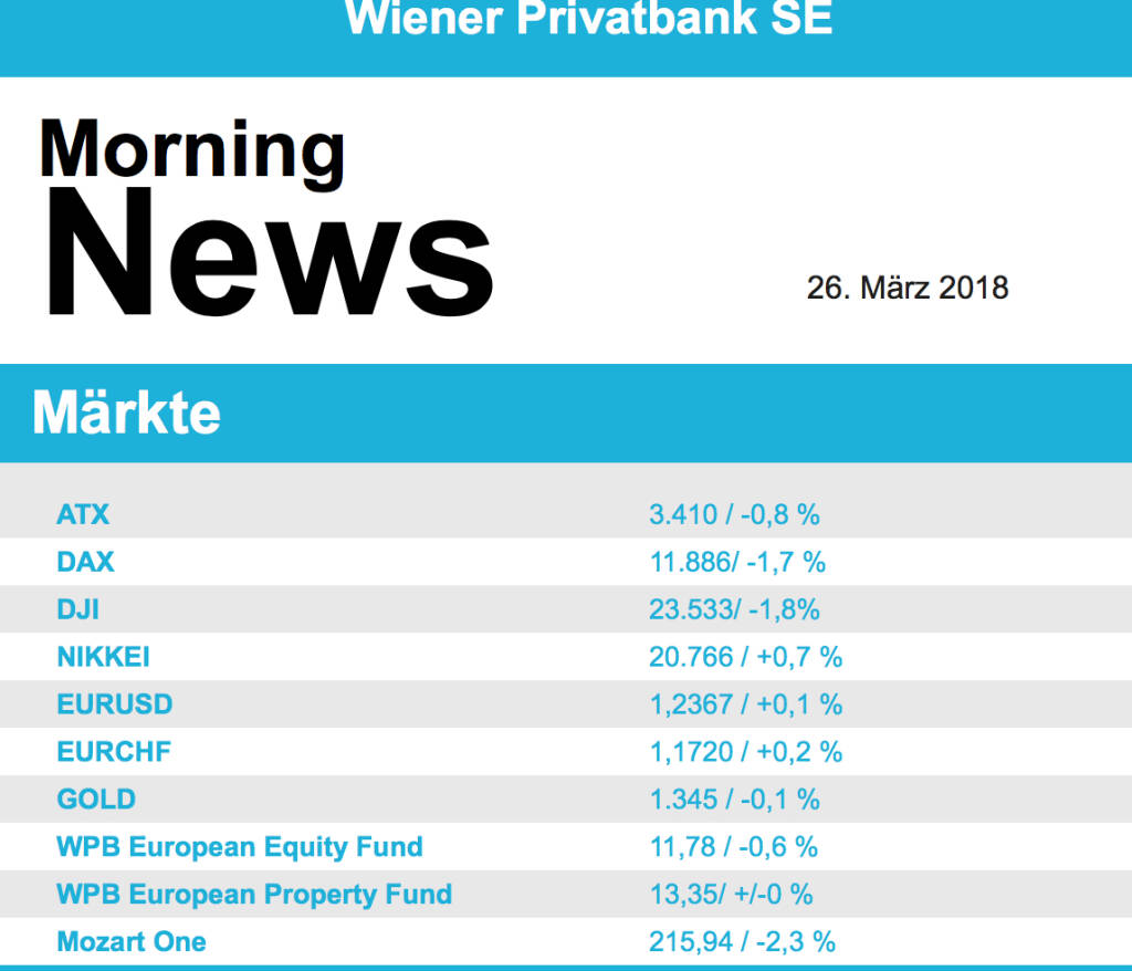 Die Sorgen um die Handelsauseinandersetzung mit China dominierten auch den Handel in den USA, die wichtigsten Indices beendeten den Tag mit deutlichen Abgaben. Peking drohte mit Gegenmaßnahmen zu den von Donald Trump beschlossenen Strafzöllen, das könnte negative Auswirkungen auf die weltweite Konjunkturentwicklung haben. Am stärksten unter Druck standen Finanzwerte und Technologieaktien. Nike konnte dank deutlich gestiegener Erlöse ein Plus von 0,3% erzielen und war gemeinsam mit Boeing (plus 0,4%) Gewinner unter den Dow Jones Titeln. Pfizer musste 3,1% abgeben, nachdem sich nun auch Glaxo SmithKline aus den Verkaufsgesprächen um das Geschäft mit rezeptfreien Medikamenten verabschiedet hat. Für Aufsehen sorgte der Börsengang des Online-Speicherdienstes Dropbox , zwischenzeitlich wurde die Aktie mehr als 50 Prozent über dem Ausgabekurs gehandelt, am Ende blieb ein Zuwachs von 35,6%.