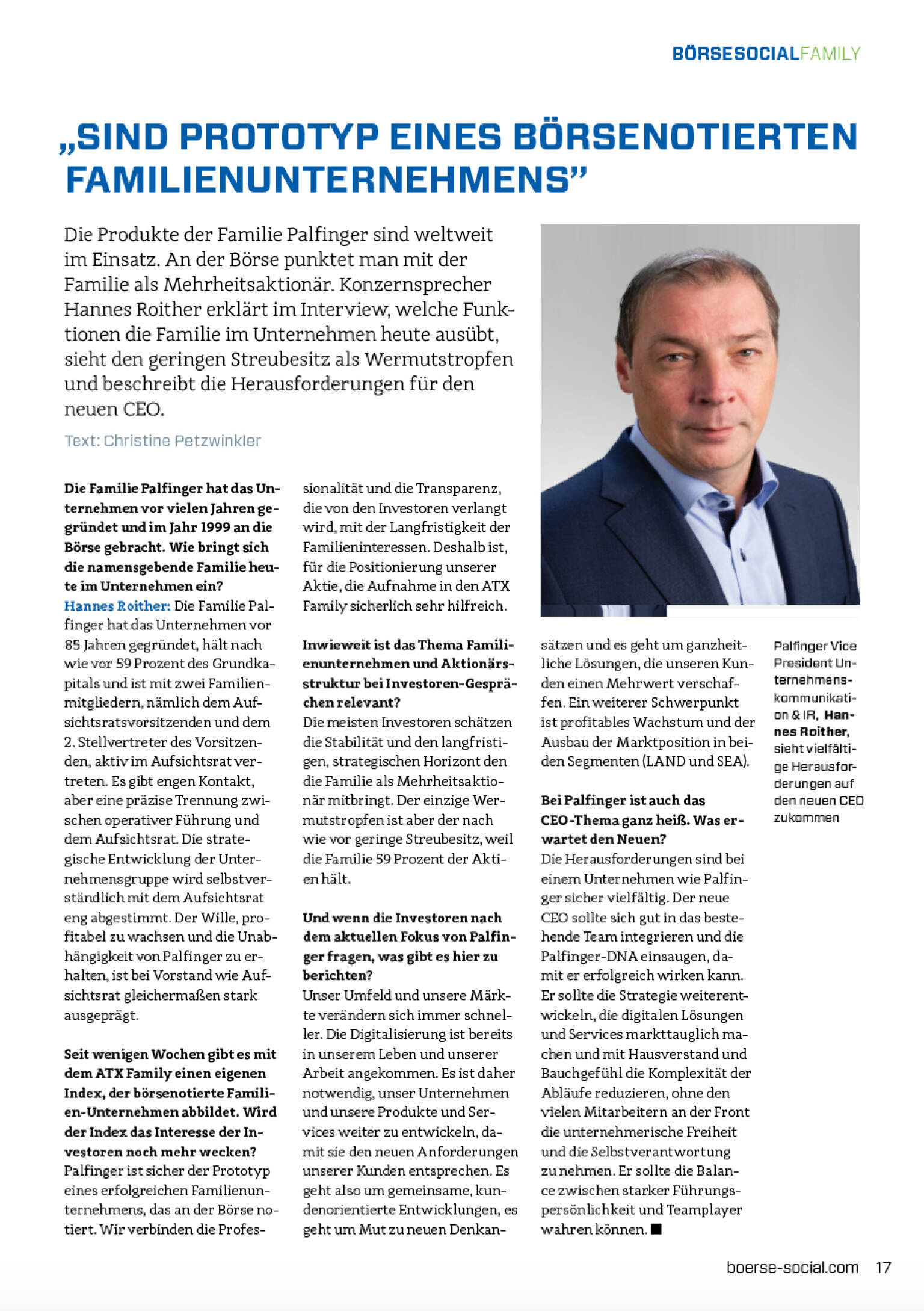 Palfinger ist sicher der Prototyp eines erfolgreichen Familienunternehmens, das an der Börse notiert. Wir verbinden die Professionalität und die Transparenz, die von den Investoren verlangt wird, mit der Langfristigkeit der Familieninteressen. Deshalb ist, für die Positionierung unserer Aktie, die Aufnahme in den ATX Family sicherlich sehr hilfreich.