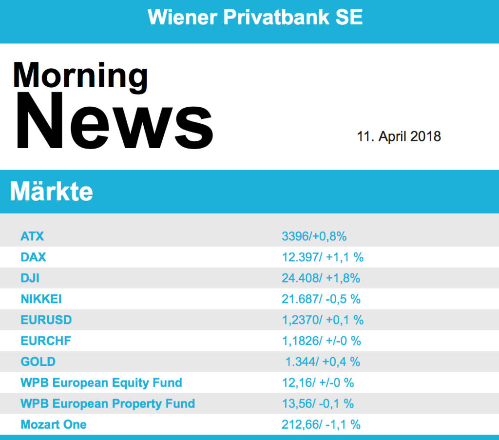 - Die Bullen waren gestern wieder aktiv: Hoffnungen auf ein Ende des Handelsstreits haben die Kurse nach oben getrieben. Chinas Präsident Xi Jinping hat niedrigere Importzölle auf Autos und Erleichterungen bei Investitionen in chinesische Unternehmen angekündigt. Deshalb hoffte der Markt auf eine Entspannung im Handelsstreit. LVMH Moet Hennessy Louis Vuitton hat im ersten Quartal dank der größten Sparte einen kräftigen Umsatzanstieg erzielt. Der Kurs gewann 4,9 Prozent. Givaudan ist im ersten Quartal 2018 gewachsen, aber nicht so stark wie am Markt erwartet. Givaudan verloren 2,4 Prozent, im Fahrwasser notierten die Aktien des Wettbewerbers Symrise 1,8 Prozent leichter. Air France-KLM fielen um 2,3 Prozent. Die Fluggesellschaft kann zwar trotz der Streiks bisher 70 Prozent der Flüge durchführen, der Gewinn wird aber trotzdem belastet, wie Analysten sagten. Der ATX konnte 0,8% zulegen, die Aktie der RBI konnte nach Klarstellungen der Firma zum Exposure an russischen sanktionierten Unternehmen (laut RBI 0,1% der Aktiva) nach einem volatilem Handelstag leicht zulegen (+1,8%). Der Verkauf der Polbank war gestern nicht stark kursbeeinflussend. Heute folgt ein Conference Call der RBI zu dem Russlandgeschäft und dem Polbankverkauf. Ansonsten wurden AT&S (+4,8%), voestalpine (+2,8%) und OMV (+2,7%) gekauft.