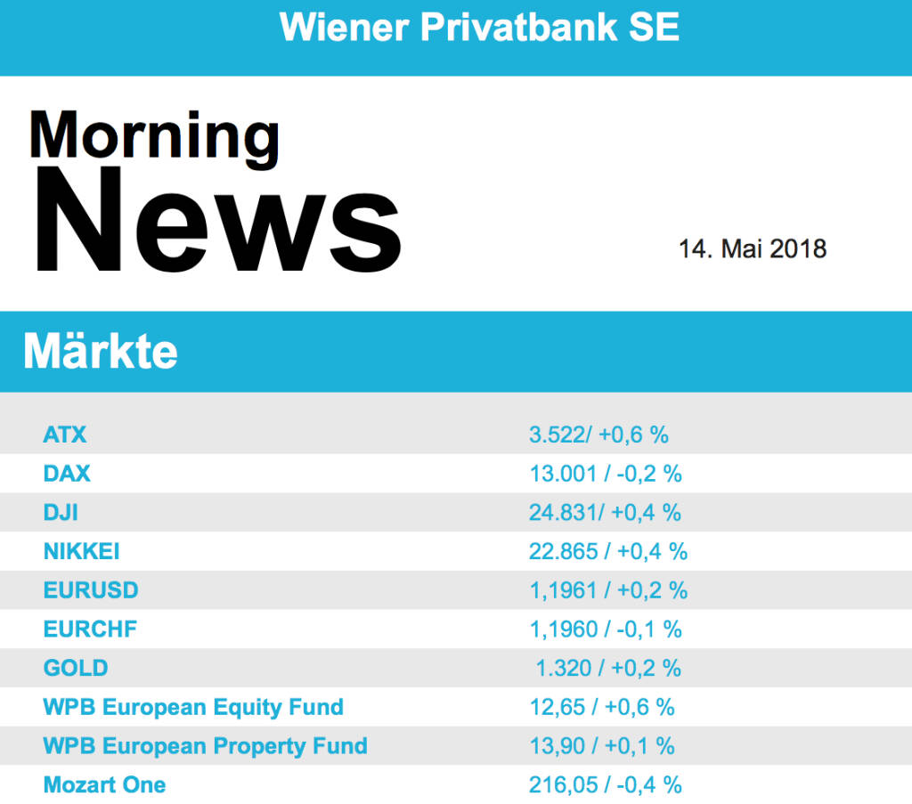 Diese Woche steht neben der Regierungsbildung in Italien die Berichtssaison im Fokus, morgen berichten RBI , ansonsten u.a. Commerzbank , Merck und Home Depot . Am Mittwoch folgen u.a. Öst. Post, FACC , Alstom. Am Donnerstag berichten u.a. Mayr-Melnhof und Wal Mart. Von der Makroseite werden morgen Industrieproduktionszahlen, der ZEW und US-Einzelhandelsumsätze veröffentlicht, am Mittwoch werden der Produzentenpreisindex (Eurozone) und US-Immobiliendaten sowie US-Industriedaten gemeldet.