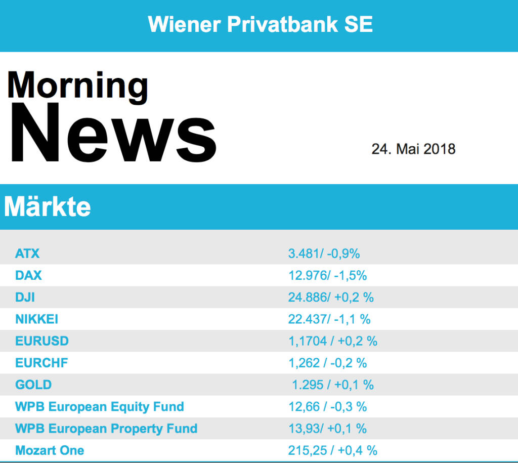 Negative Nachrichten kamen unter anderem von Konjunkturseite mit den Eurozonen-Einkaufsmanagerindizes, die die Erwartungen verfehlten. Daneben belasteten die Pläne der neuen italienischen Regierung, die zu massiven Konflikten mit den EU-Partnern führen könnten. Das drückte den Index in Mailand um weitere 1,3 Prozent, gleichzeitig fielen am Anleihemarkt die Kurse wieder deutlich. Für Zurückhaltung sorgten daneben die Handelsgespräche China-USA, mit denen US-Präsident Trump nicht zufrieden ist. Gefragt waren in diesem Umfeld sichere Häfen, aufwärts ging es mit den Kursen deutscher Bundesanleihen und auch der Goldpreis zog - besonders auf Euro-Basis - an. In der Stahlbranche, wo es nicht nach einer Verlängerung der Ausnahmeregelung für US-Stahlimporte aus Europa aussieht, verloren Arcelormittal 4,7 Prozent. Salzgitter fielen um 3,4, Thyssenkrupp um 2,3 Prozent. Daneben sorgten Berichte über Maßnahmen der chinesischen Regierung zur Senkung des Kohlepreises für Verkäufe von Bergbauaktien. Der Subindex der Rohstoffaktien verlor 2,5 Prozent. Im Öl- und Gasbereich trübten Berichte die Stimmung, nach denen die Opec über eine Produktionsausweitung nachdenken soll. Renault verloren 5,4 Prozent, nachdem CEO Carlos Ghosn Hoffnungen auf einen Zusammenschluss mit Nissan gedämpft hatte. Der ATX verlor 0,9%, verkauft wurden FACC (-5,0%), RBI (-2,9%) und OMV (-2,5%).