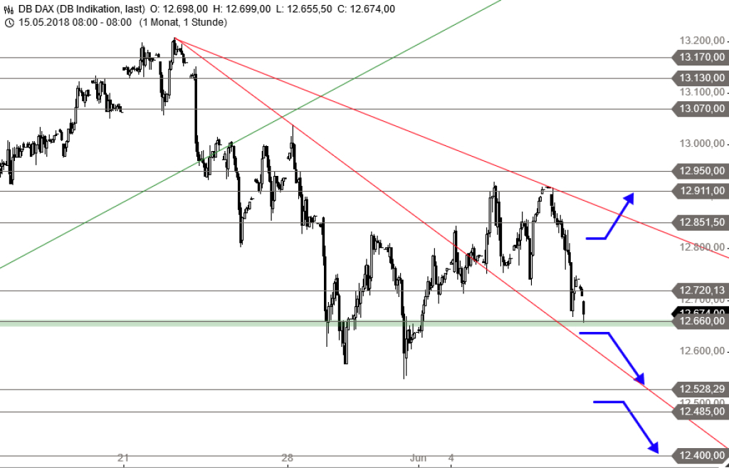 Rückblick: Im gestrigen Handel erreichte der DAX ein zweites Mal den Widerstand bei 12.911 Punkten und prallte wiederum nach unten ab. Damit bildete sich ein bärisches Doppelhoch, das durch eine anschließende Verkaufswelle unter die 12.720 Punkte-Marke im nachbörslichen Handel aktiviert wurde. Im vorbörslichen Handel steht der DAX wieder Aug in Aug mit der Unterstützung bei 12.660 Punkten, deren Bruch jetzt für ein weiteres Verkaufssignal sorgen würde.